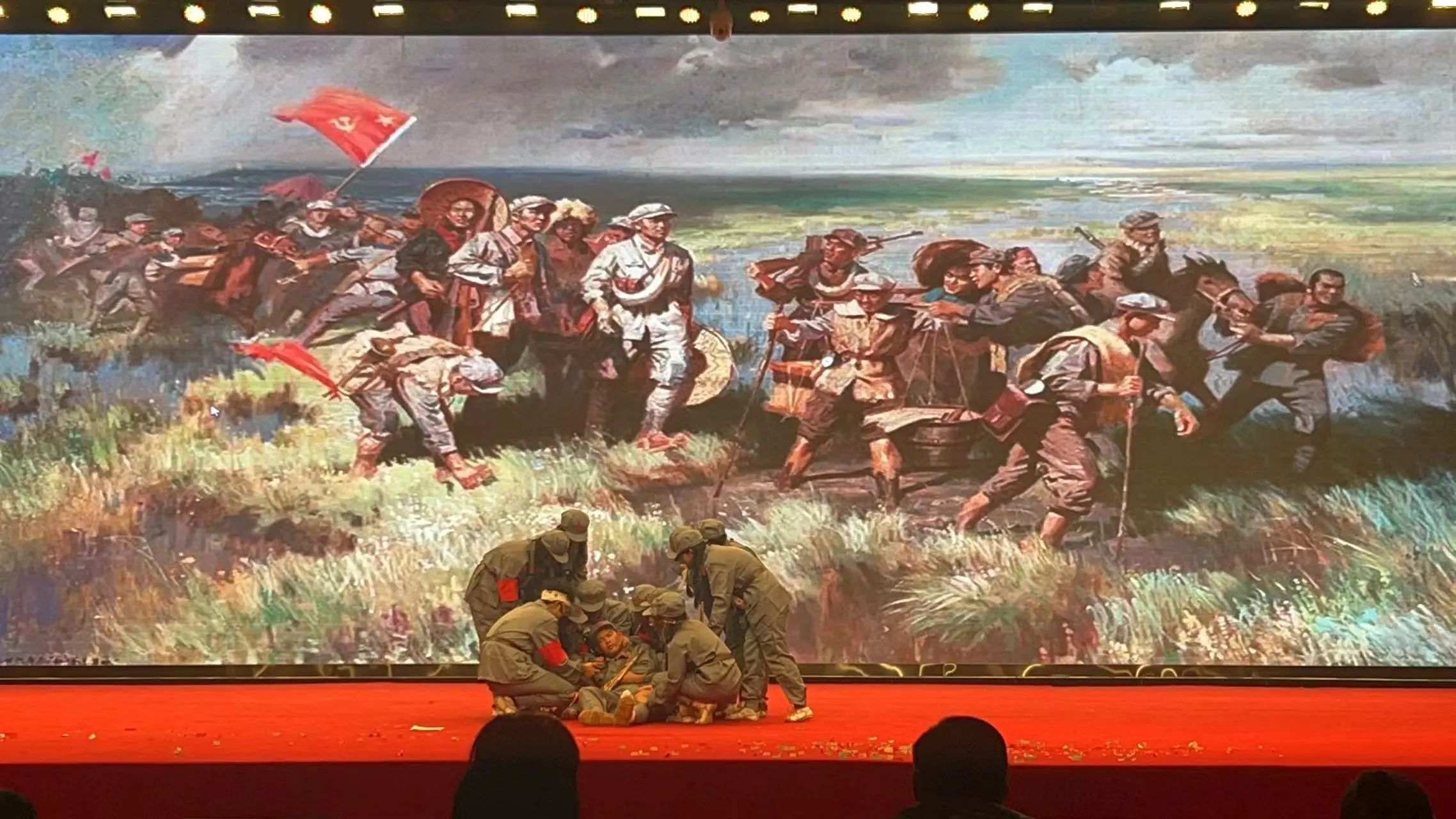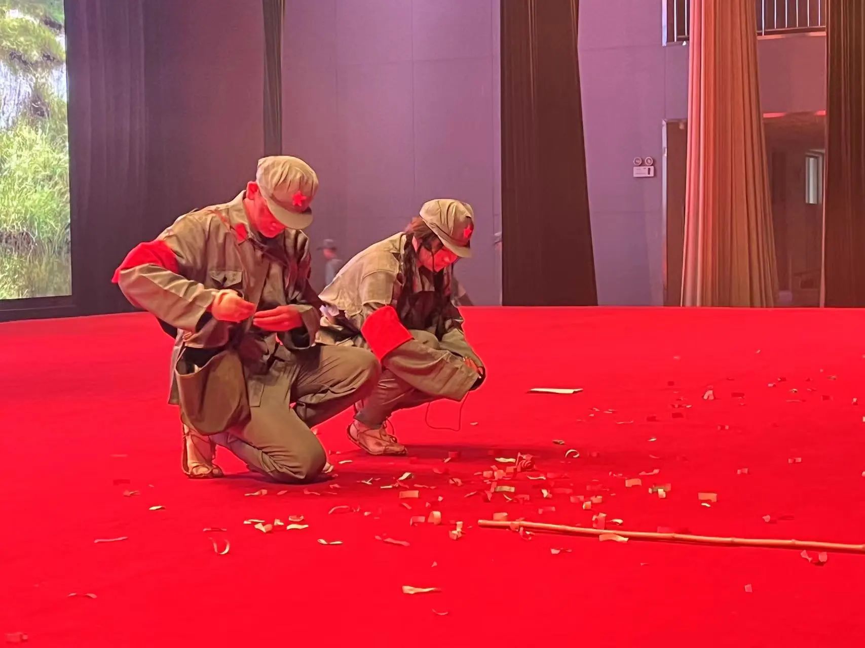 參演的同學們個個氣宇軒昂,臺詞鏗鏘有力,將角色刻畫得淋漓盡致。將紅軍歷程的艱苦奮斗、臨危不懼充分展現出來,劇情中老班長的奉獻精神、紅軍們的謙讓精神和堅韌不拔的毅力被參演同學有聲有色地帶入舞臺中央。