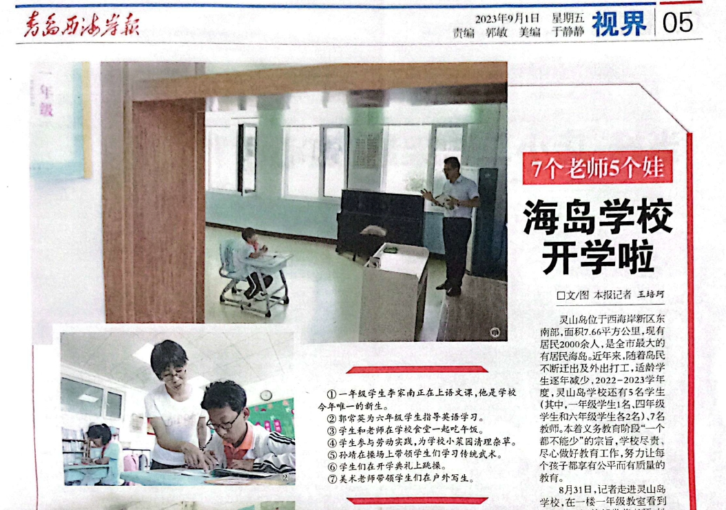 一次偶然的機會,青島黃海學院國際商學院與經濟管理學院外語系黨支部書記孫伶莉從兒子帶回家的一份《青島西海岸報》中,讀到了一則名為《7個老師5個娃 海島學校開學了》的報道。文中介紹說,近年來隨著島民不斷遷出及外出打工,適齡學生逐年減少,2022-2023學年度,靈山島學校只有5名學生。但是本著義務教育階段“一個都不能少”的宗旨,學校盡責、盡心做好教育工作,努力讓每個孩子都享有公平而有質量的教育。