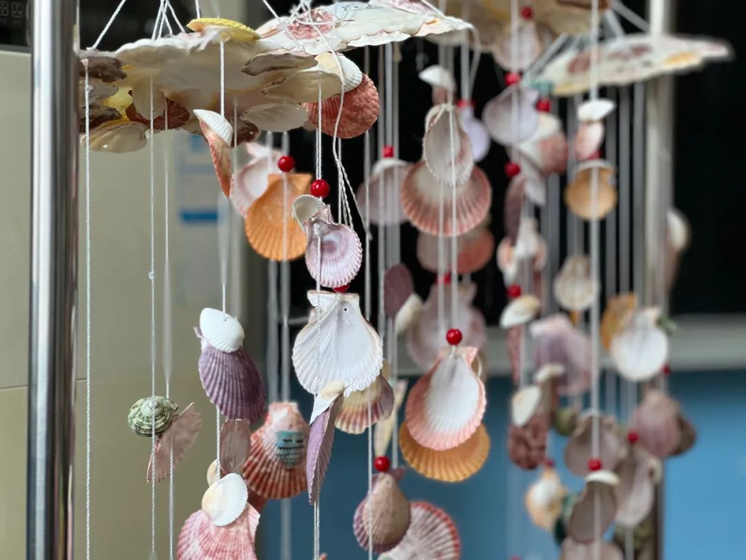 隨后,張云英主任帶領黃海學院老師們參觀了該校歷屆學生的手工藝作品展。大自然是最好的老師,該校以“石頭花開”“貝殼綻放”為主題,讓學生利用海島資源,在石頭上作畫,將貝殼做成手工藝品。所有參觀老師無不為海島老師和孩子們的奇思妙想贊嘆稱奇。