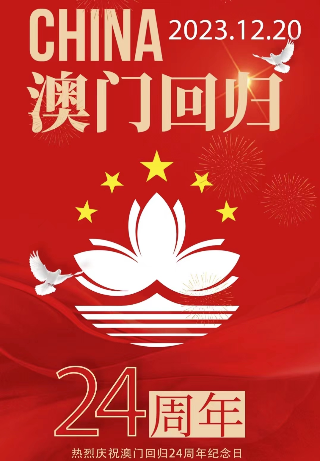 今天,我們迎來了澳門回歸 24 周年的喜慶日子!在這個特別的日子里,讓我們一起為澳門送上最熱烈的祝福,祝愿澳門這朵盛世蓮花在祖國的懷抱中綻放出更加絢爛的光彩!