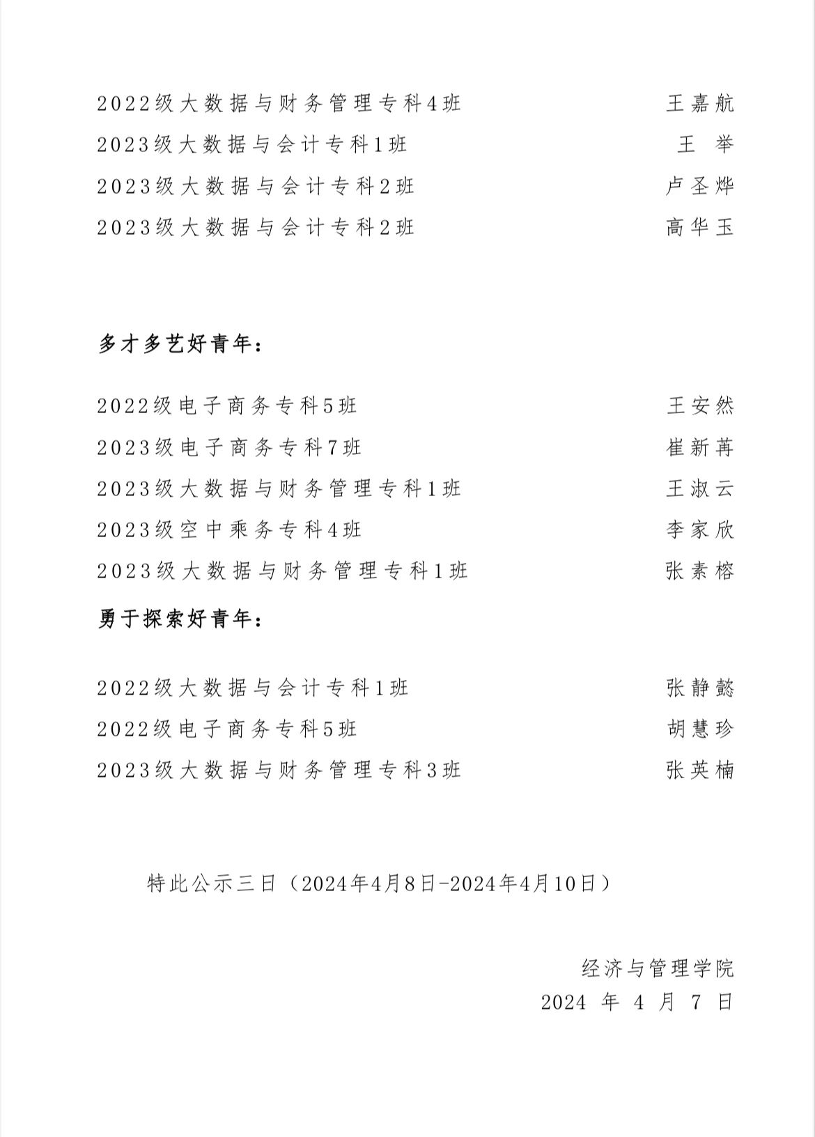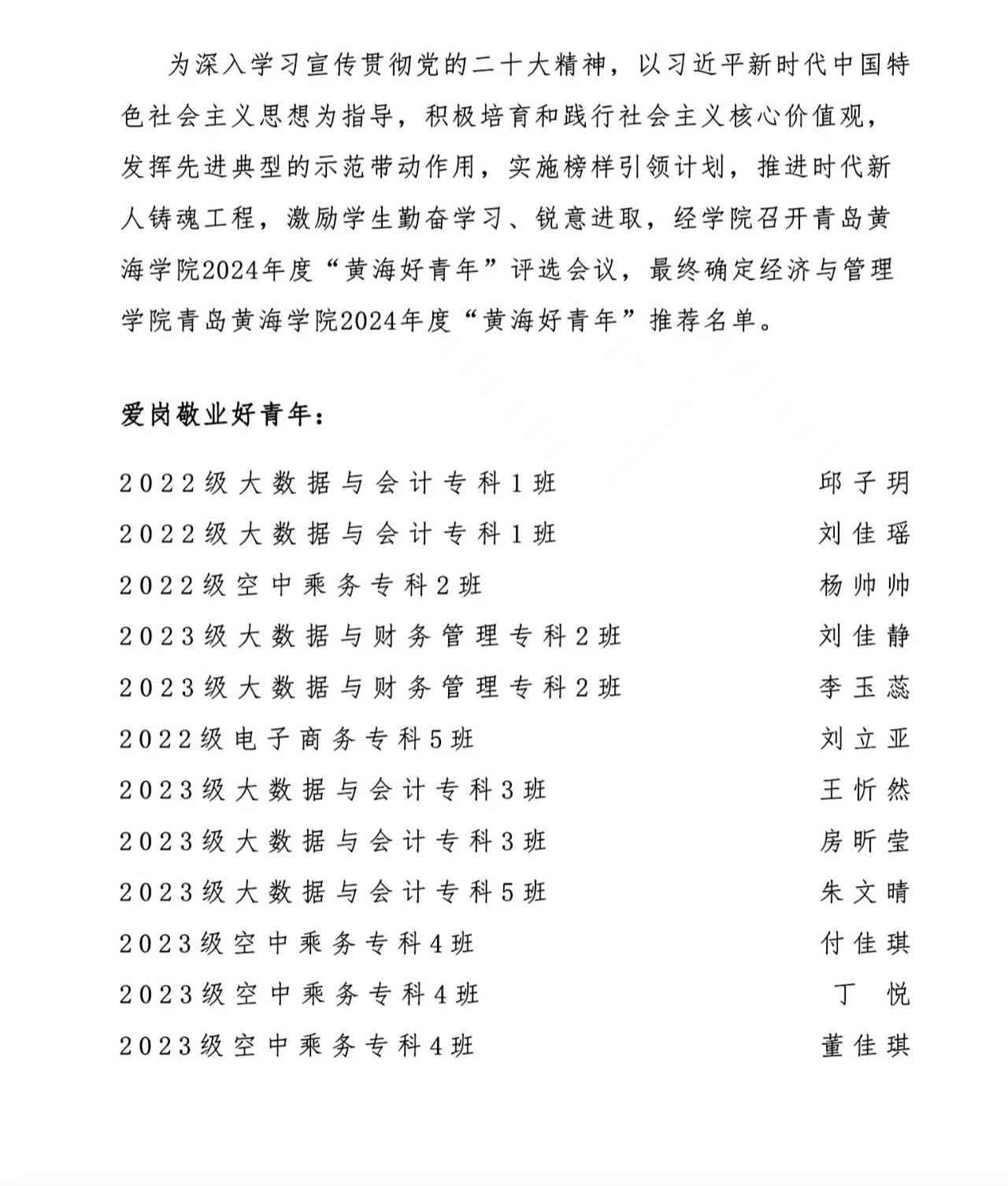 經濟與管理學院2024 年度“ 黃海好青年”名單公示