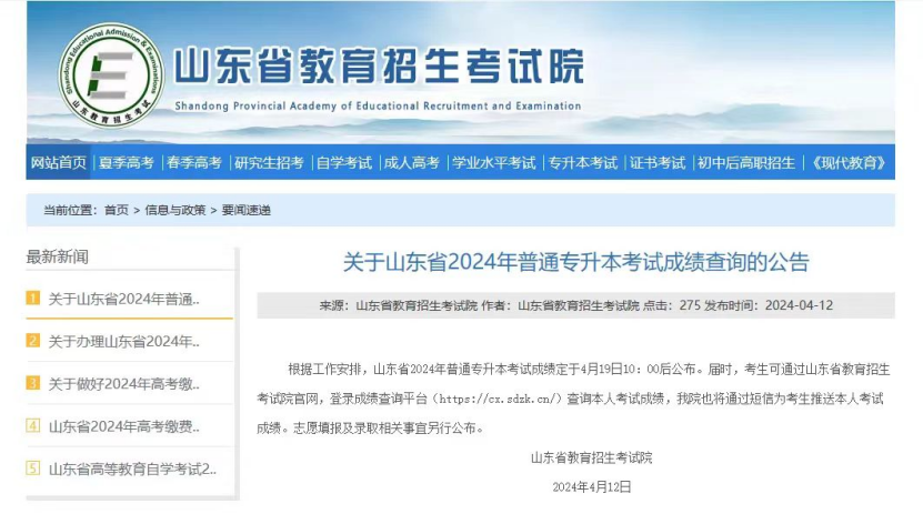 根據工作安排,山東省2024年普通專升本考試成績定于4月19日10:00后公布。屆時,考生可通過山東省教育招生考試院官網,登錄成績查詢平臺(https://cx.sdzk.cn/)查詢本人考試成績,我院也將通過短信為考生推送本人考試成績。志愿填報及錄取相關事宜另行公布。