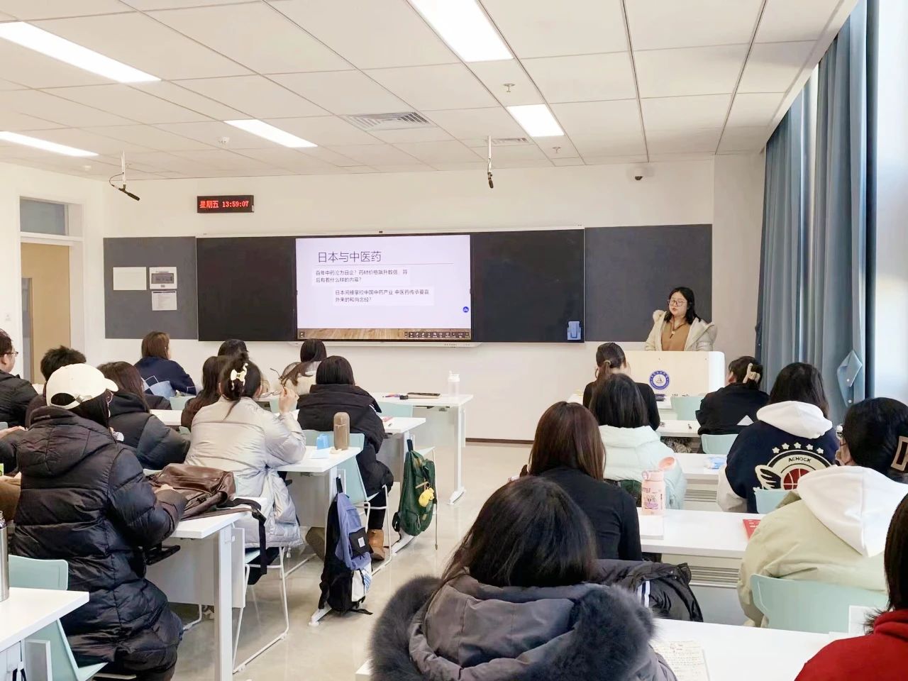 聲音洪亮的胡曉晗同學給大家分享北京同仁堂,從 “神農償百草”講到《皇帝內經》;從扁鵲的“望、聞、問、切”講到了李時珍的《本草綱目》;從百年中藥淪為日企講到中藥傳承,底下的學生徹底繃不住了,一個男生不知道是緊張還是激動,臉微微發紅,站起來說“我們一定要保護好自己的中藥。”“對,中藥是我們的!”“好好學習,建設祖國!”“為中華之崛起而讀書!”……