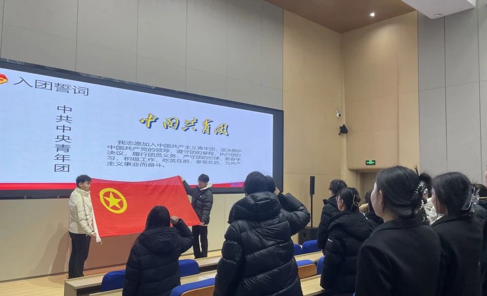 而最具儀式感的,莫過于團徽的頒發與佩戴環節,朱升學老師面帶微笑,將一枚枚閃耀著光芒的團徽遞到新團員手中,并親手為他們佩戴。隨后,在黃泰的帶領下,新團員們面向團旗,舉起右拳,莊嚴宣誓。“我志愿加入中國共產主義青年團……”那一聲聲誓言,在空氣中回蕩,是他們對共青團最忠誠的承諾,是他們內心深處對理想信念的堅定表達。