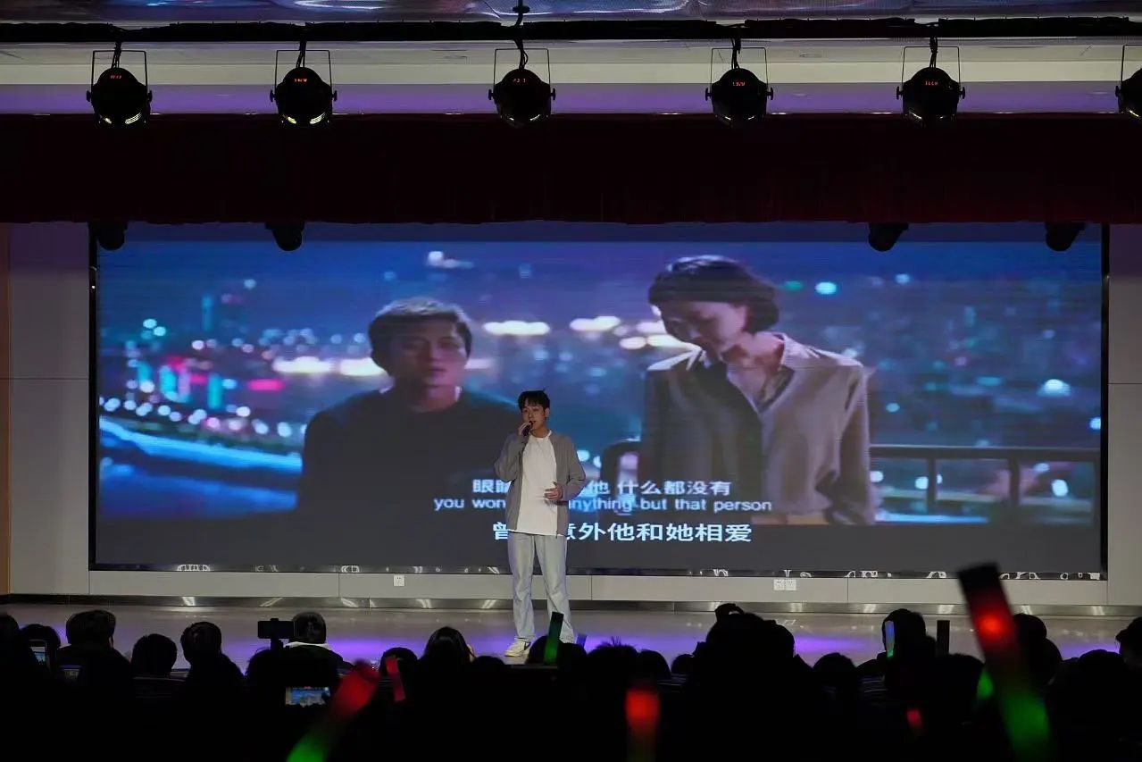 在主持人介紹過各位評委老師后。我們一同唱響國歌。隨后上屆校園十佳歌手陳心昊為我們帶來了一首動人心弦的《一城山水》,讓觀眾們進入到了音樂的世界。