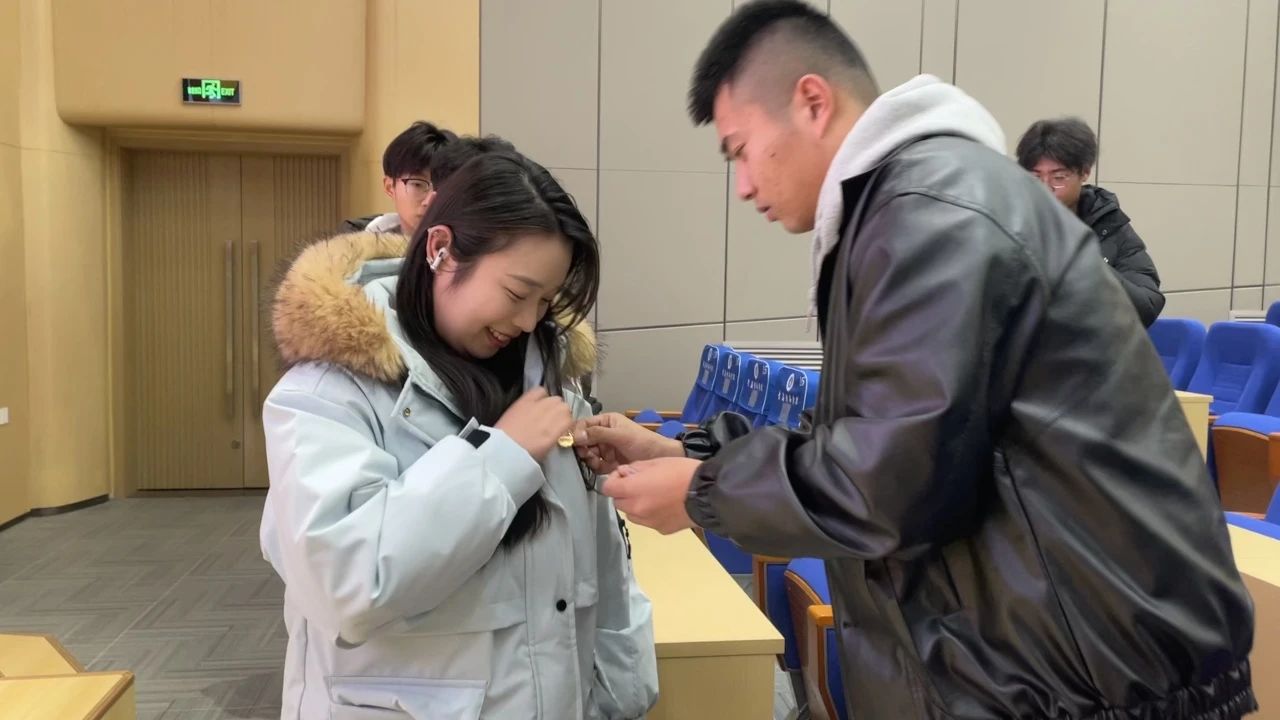而最具儀式感的,莫過于團徽的頒發與佩戴環節。朱升學老師面帶微笑,將一枚枚閃耀著光芒的團徽遞到新團員手中,并親手為他們佩戴。團徽在新團員的胸前熠熠生輝,這小小的徽章,承載著無上的光榮與重大的責任,它是共青團員身份的象征,是對新團員的激勵與鞭策。