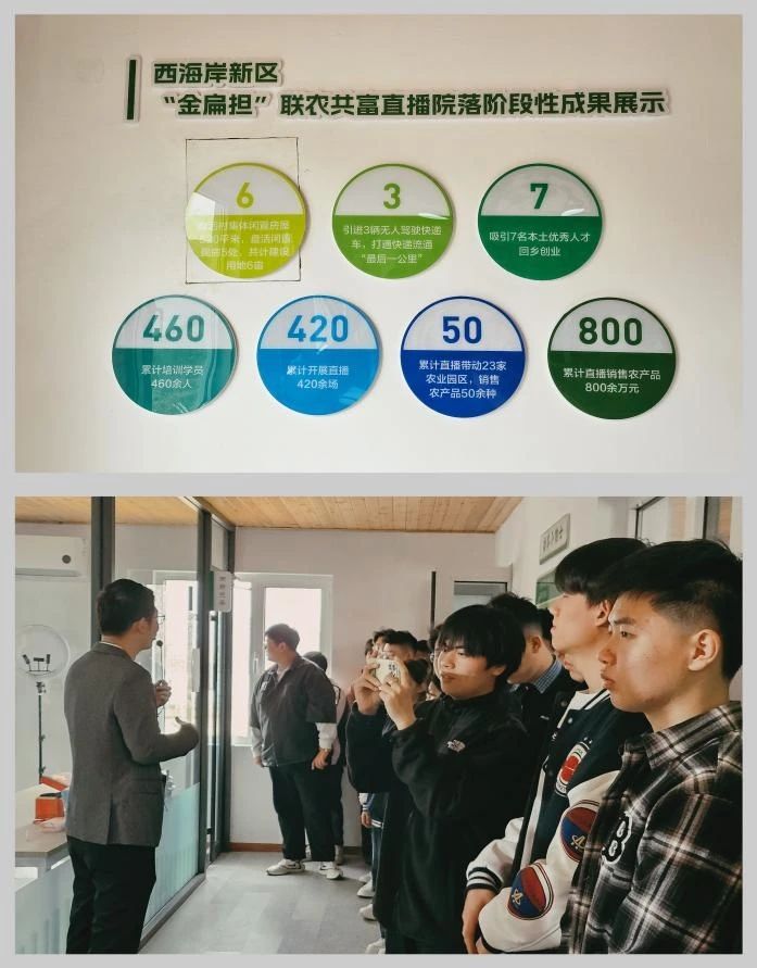 4月7日,由數字商務學院院長助理李燕帶隊,電子商務教研室教師及30余名專業學生組成的訪企團,來到西海岸新區大村鎮"金扁擔"聯農共富直播基地,參觀基地直播實況,探討校企合作新模式。