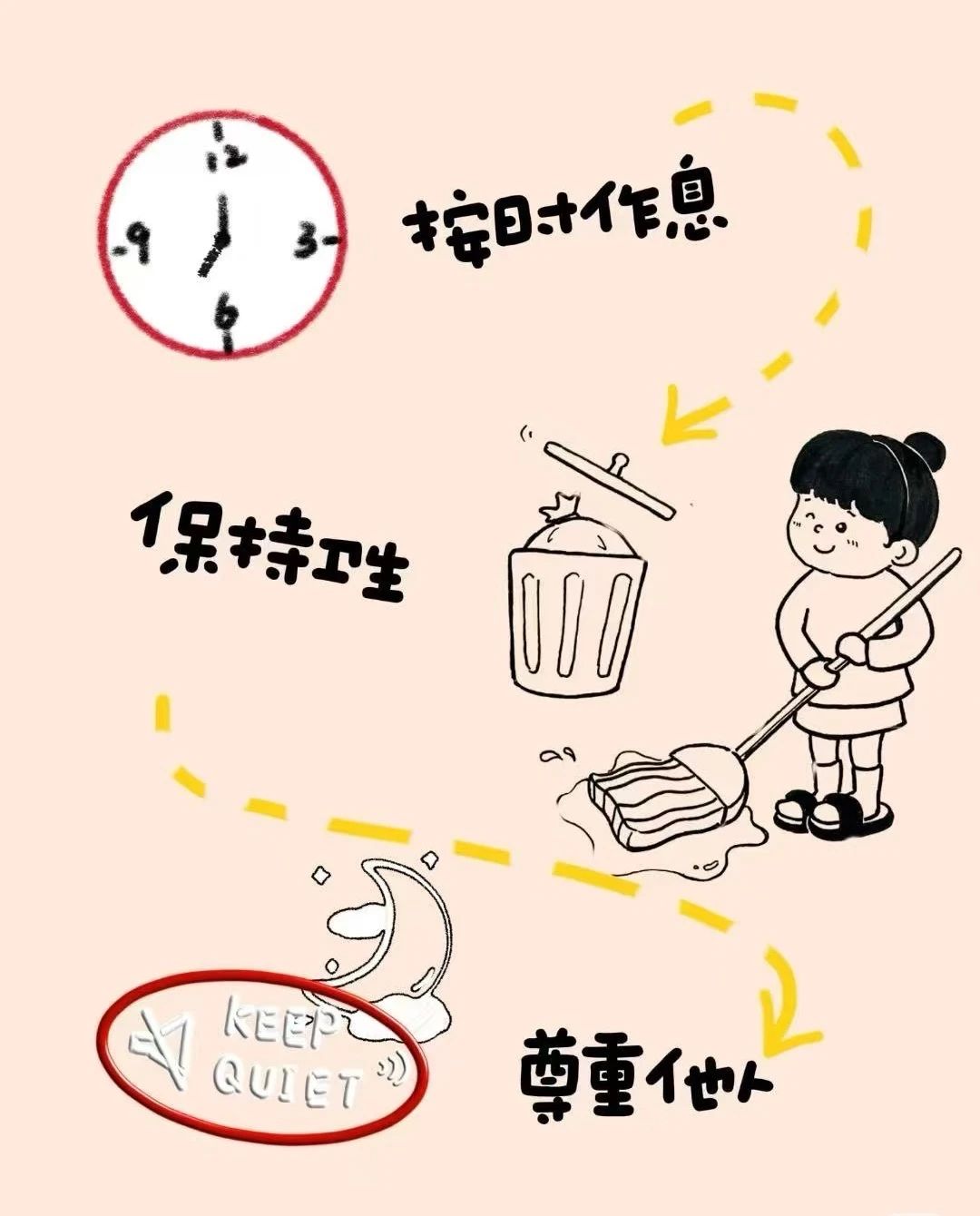 不臟亂:不隨意堆放垃圾,不破壞宿舍衛生。