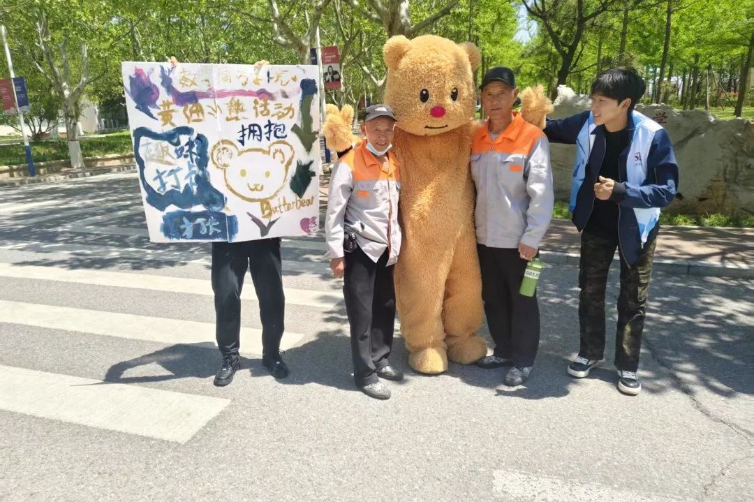 當第一縷陽光爬上教學樓的窗臺,一只黃油小熊停在熙熙攘攘的體育館的路口。路過的同學先是好奇地駐足,繼而被小熊憨態可掬的招手動作逗笑。猶豫片刻后,一位女生輕輕上前,投入那團毛茸茸的懷抱。小熊溫柔地拍了拍她的背,這一刻,所有早起的困倦與課業的壓力,仿佛都被這溫暖的擁抱揉碎,化作嘴角的一抹笑意。