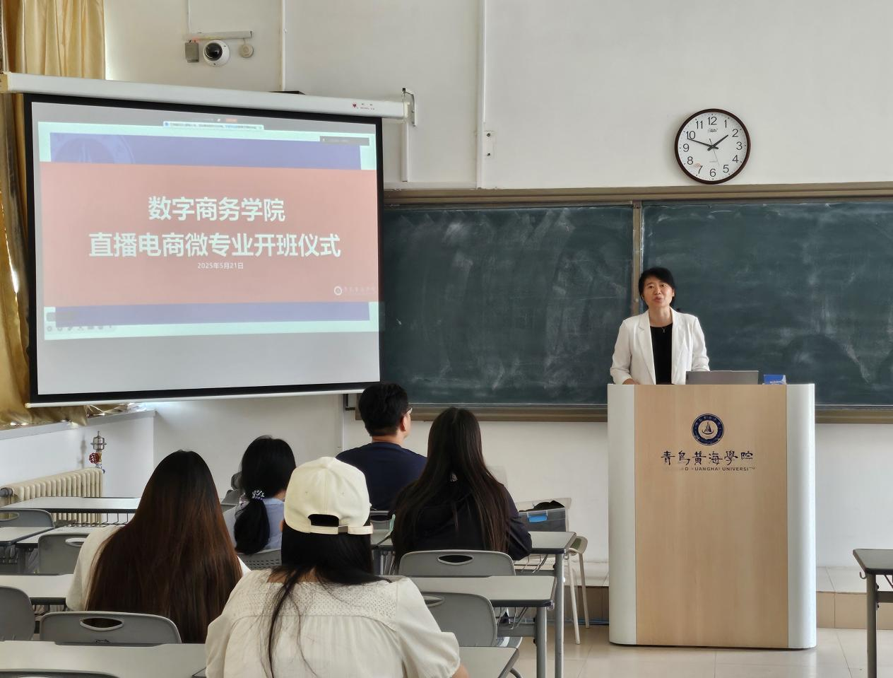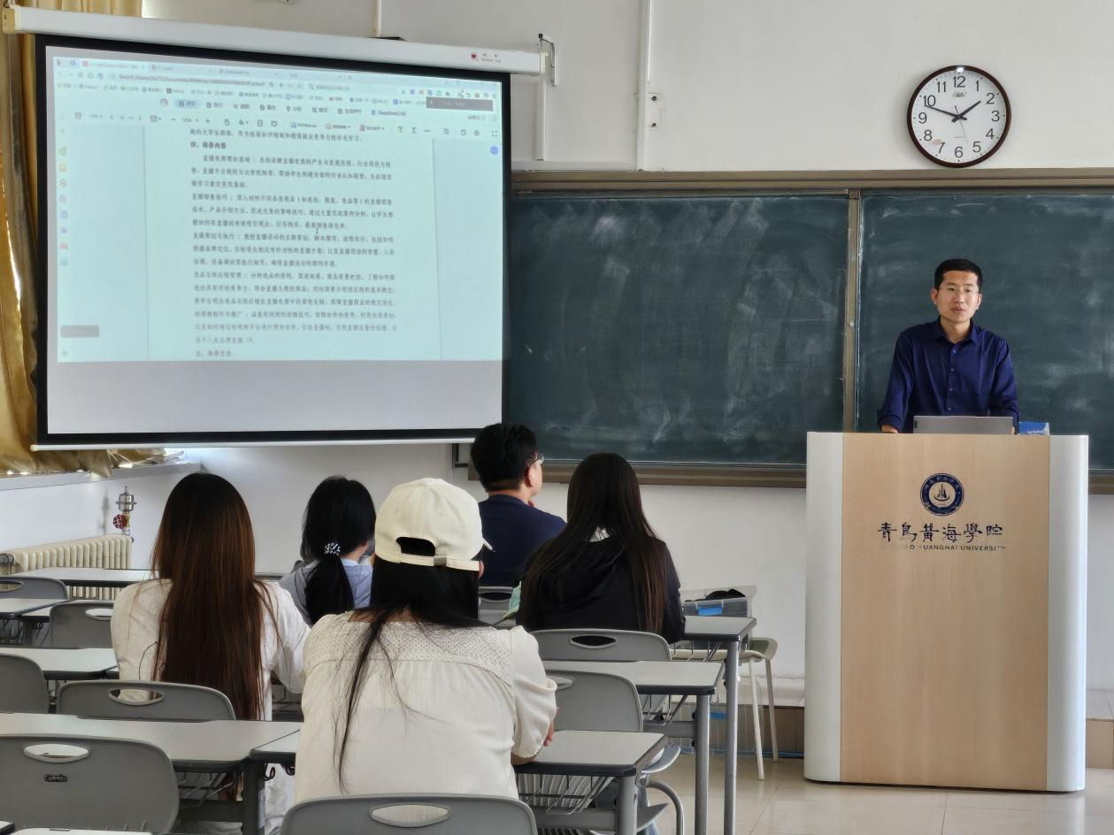 隨后,電子商務教研室主任陳修龍給學生們介紹了課程的考核方式,并系統的講解了直播電商微專業全方位知識體系,從直播平臺的運營管理、主播素養的塑造與提升,到商品供應鏈的整合管理、直播營銷策略的精準制定與實施,再到數據分析與粉絲運營等核心課程,每一塊內容都緊密貼合行業實際需求,幫助學生構建起堅實的專業知識架構。
