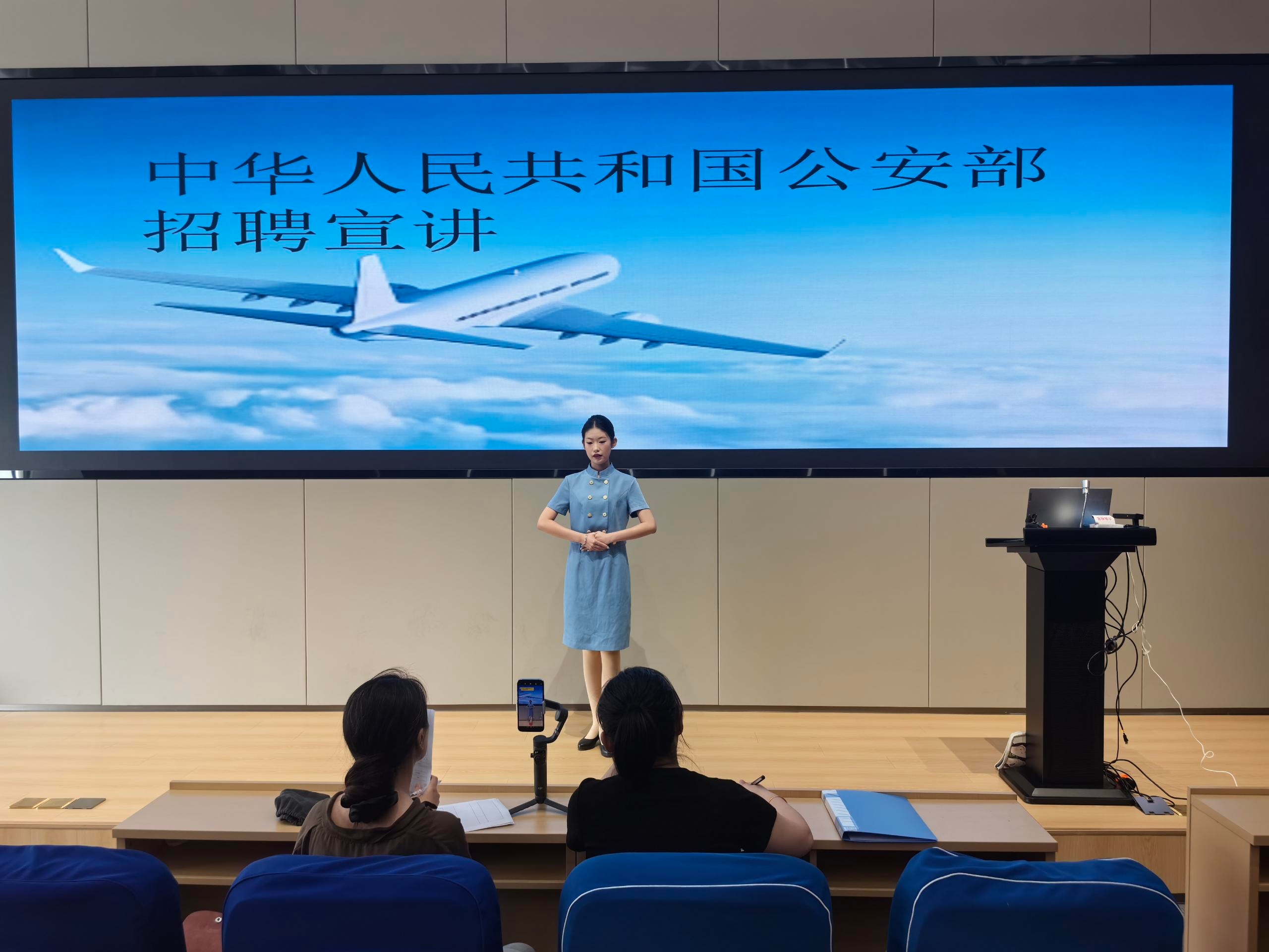 公安部招聘工作組詳細介紹了招聘崗位、應聘條件及福利待遇,并分享了職業發展路徑與工作內容。同學們對公安系統的就業機會表現出濃厚興趣,現場互動積極。 宣講結束后,公安部工作組對報名學生進行了資格審核與面試。同學們踴躍參與,展現了空乘學子的專業素養與求職熱情。