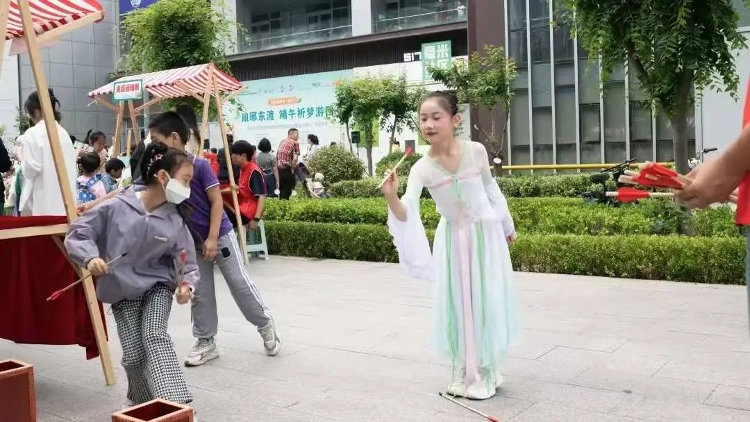 十大民俗技藝與端午習俗攤位,是本次活動的亮點所在。“小黃鋒”志愿者們分散在各個攤位前,為居民們提供一對一的貼心協助。五彩手繩編織攤前,他們手把手教小朋友打結、纏繞,讓寓意吉祥的手繩在指尖誕生;非遺技藝攤位前,志愿者們同樣忙得不亦樂乎。剪紙區里,他們幫忙鋪展紅紙、遞送剪刀,協助居民剪出精美的祥瑞窗花;面塑攤旁,手把手教孩子們揉捏塑形,讓各色面團變成栩栩如生的可愛瑞獸;糖畫攤位上,協助藝人穩住石板、傳遞工具,看著滾燙的糖漿在居民手中勾勒出靈動圖案;拓印區域,志愿者們仔細地幫大家鋪宣紙、刷墨汁,當古樸的文字圖案緩緩顯現,歷史的厚重感與文化的傳承魅力撲面而來。
