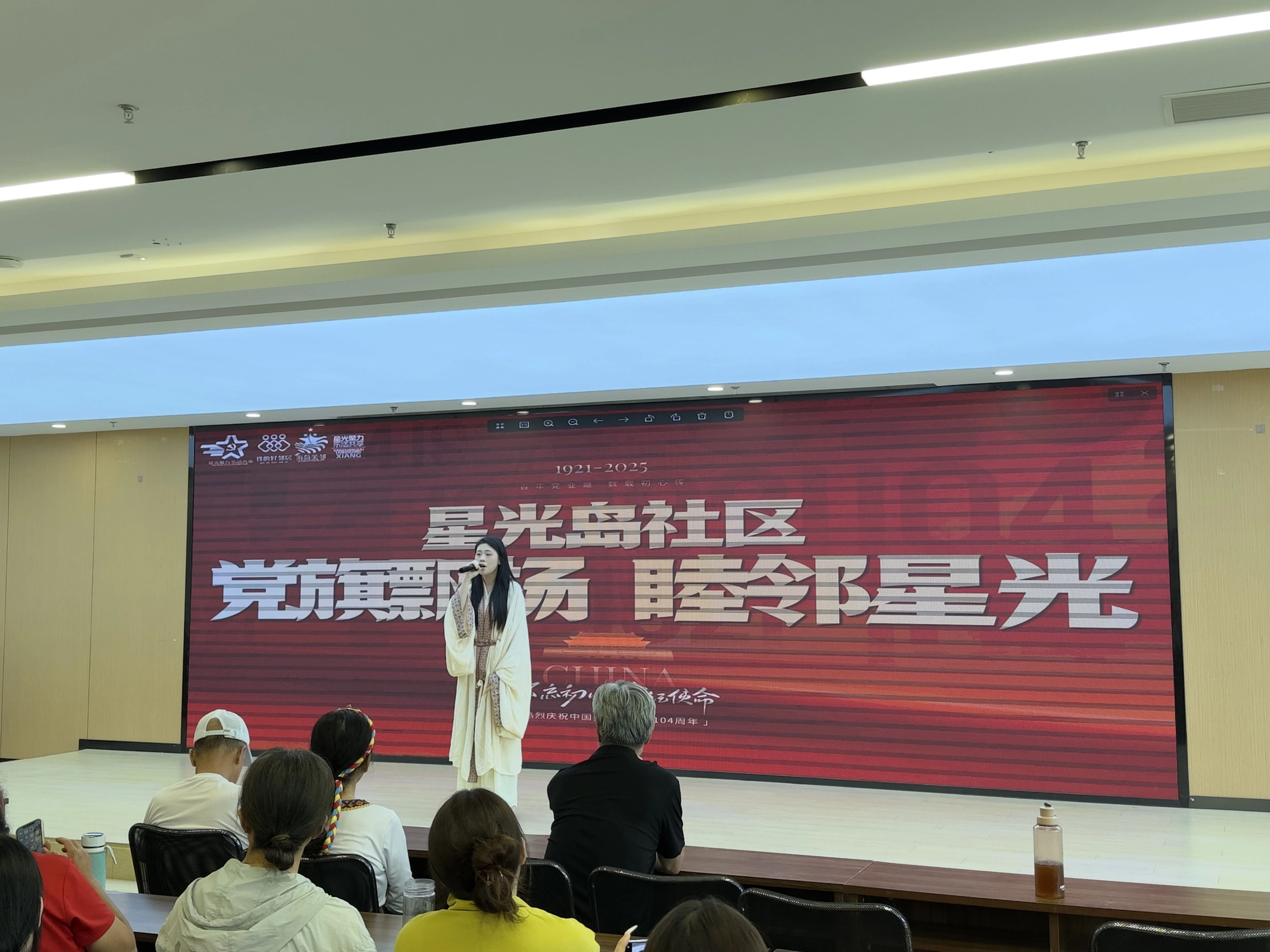活動當日,星光島社區廣場上彩旗飄揚,氣氛熱烈。數字商務學院的同學身著整齊的服裝,精神抖擻地走上舞臺。帶來的歌曲《春花秋月何時了》,宛如一陣清風,吹進了每一位觀眾的心田。熟悉的旋律響起,演唱的同學飽含深情地歌唱,真摯的情感和優美的歌聲,使現場掌聲、歡呼聲此起彼伏。