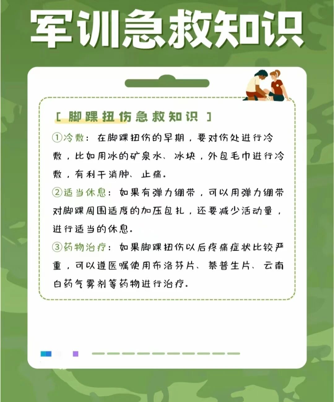 如果在軍訓中受傷,首先要保持冷靜,避免慌亂。對于輕微擦傷或扭傷,可用冰敷處理;對于嚴重受傷(如骨折、嚴重拉傷等),應立即停止訓練,并尋求醫療幫助。