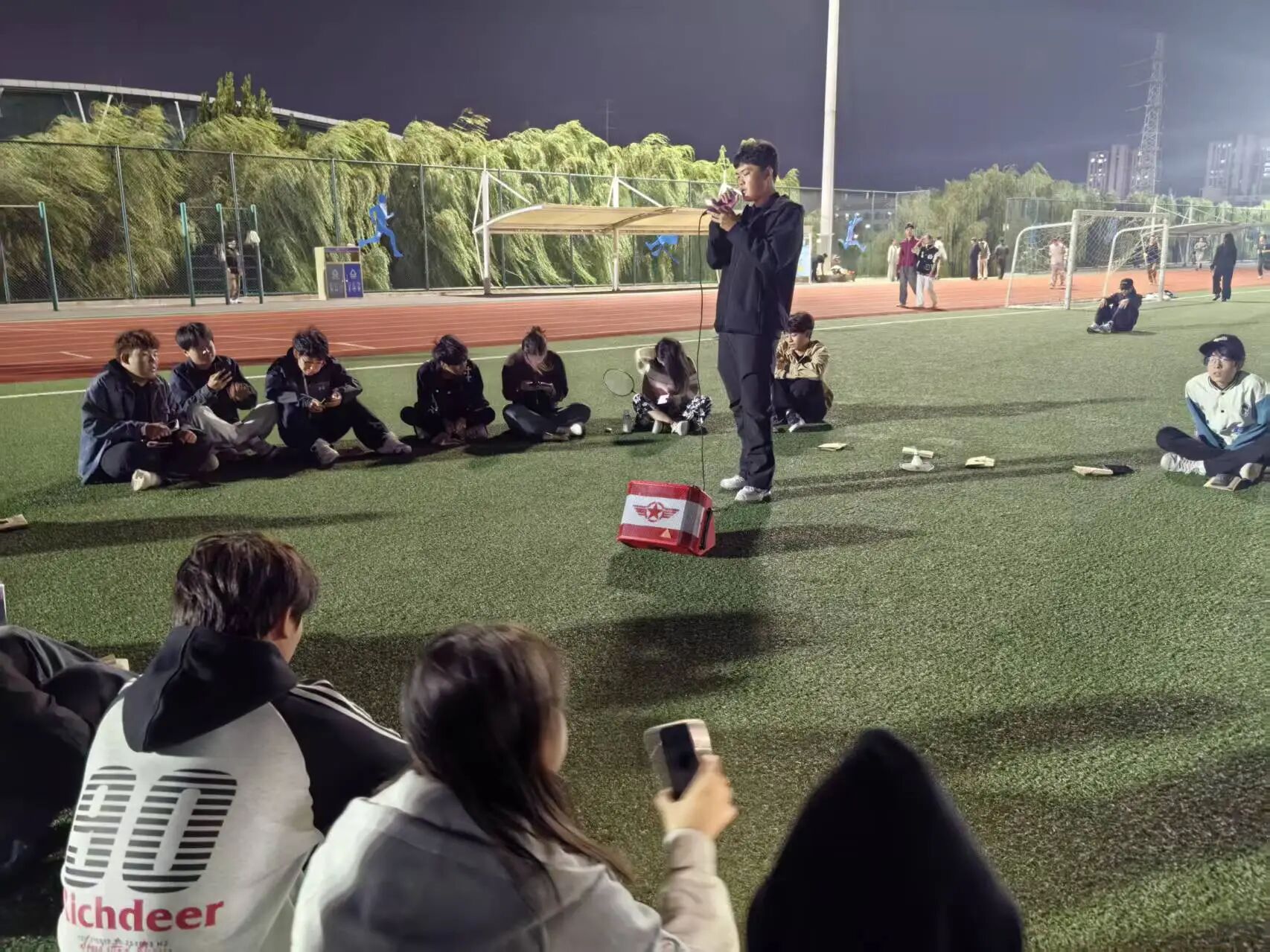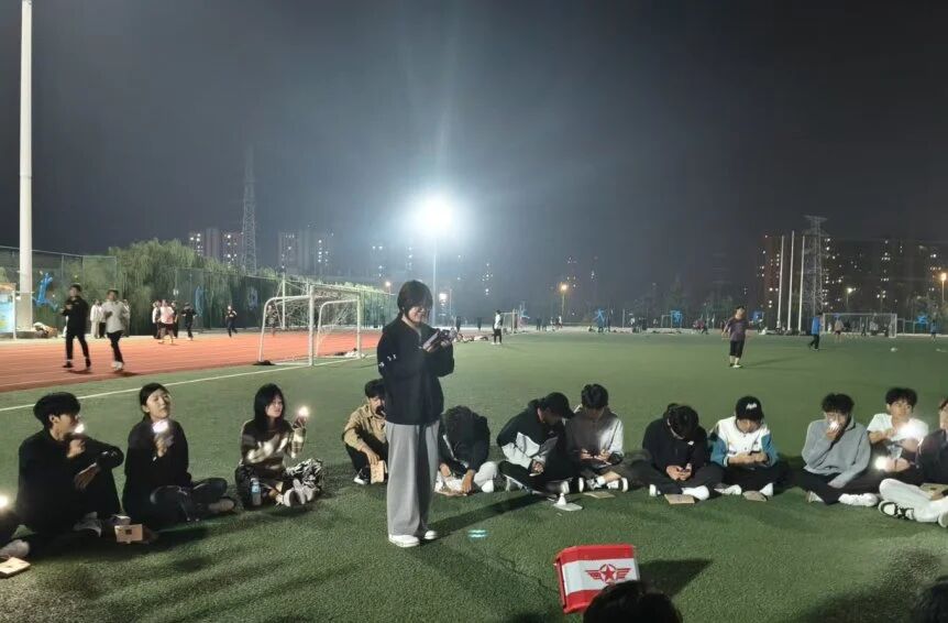 晚風習習,同學們三五成群,圍坐在操場的草坪上。手機手電筒化作點點“星光”,隨著旋律輕輕搖擺。這里沒有專業的音響設備,只有一位同學帶來的便攜藍牙音箱;這里也沒有固定的歌手,每一位熱愛歌唱的同學都是當晚最耀眼的主角。