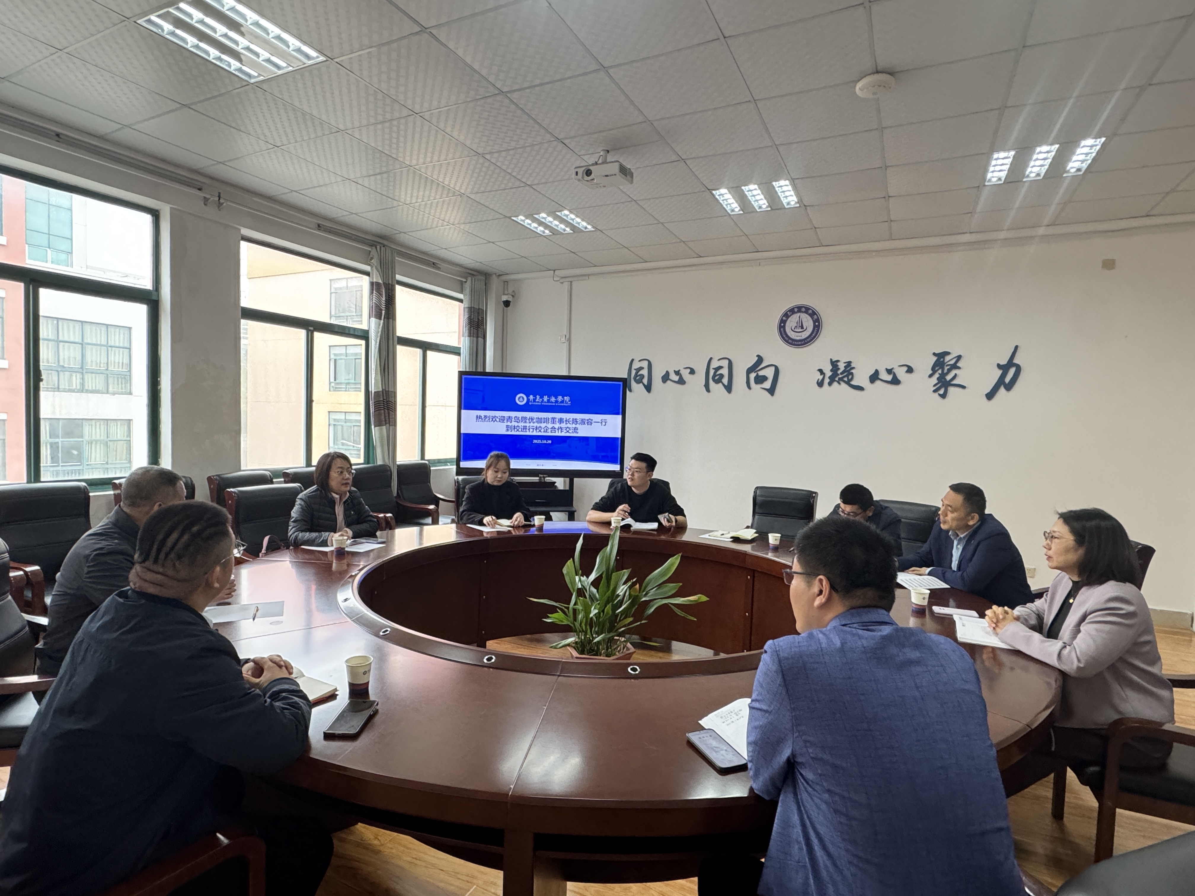 為積極響應國家產教融合戰略,推動教育鏈與產業鏈的精準對接,2025年10月20日,青島陛優咖啡董事長陳淑容、山東泰合瑞盛總經理田高杰、黃島書畫院院長李英建等企業代表一行蒞臨青島黃海學院,就校企合作、資源共享、人才共育等核心議題與學校展開深度交流。青島黃海學院創新創業教育學院副院長甄程、合作發展處處長助理莊偉及相關院系負責人熱情接待,為后續合作奠定堅實基礎。