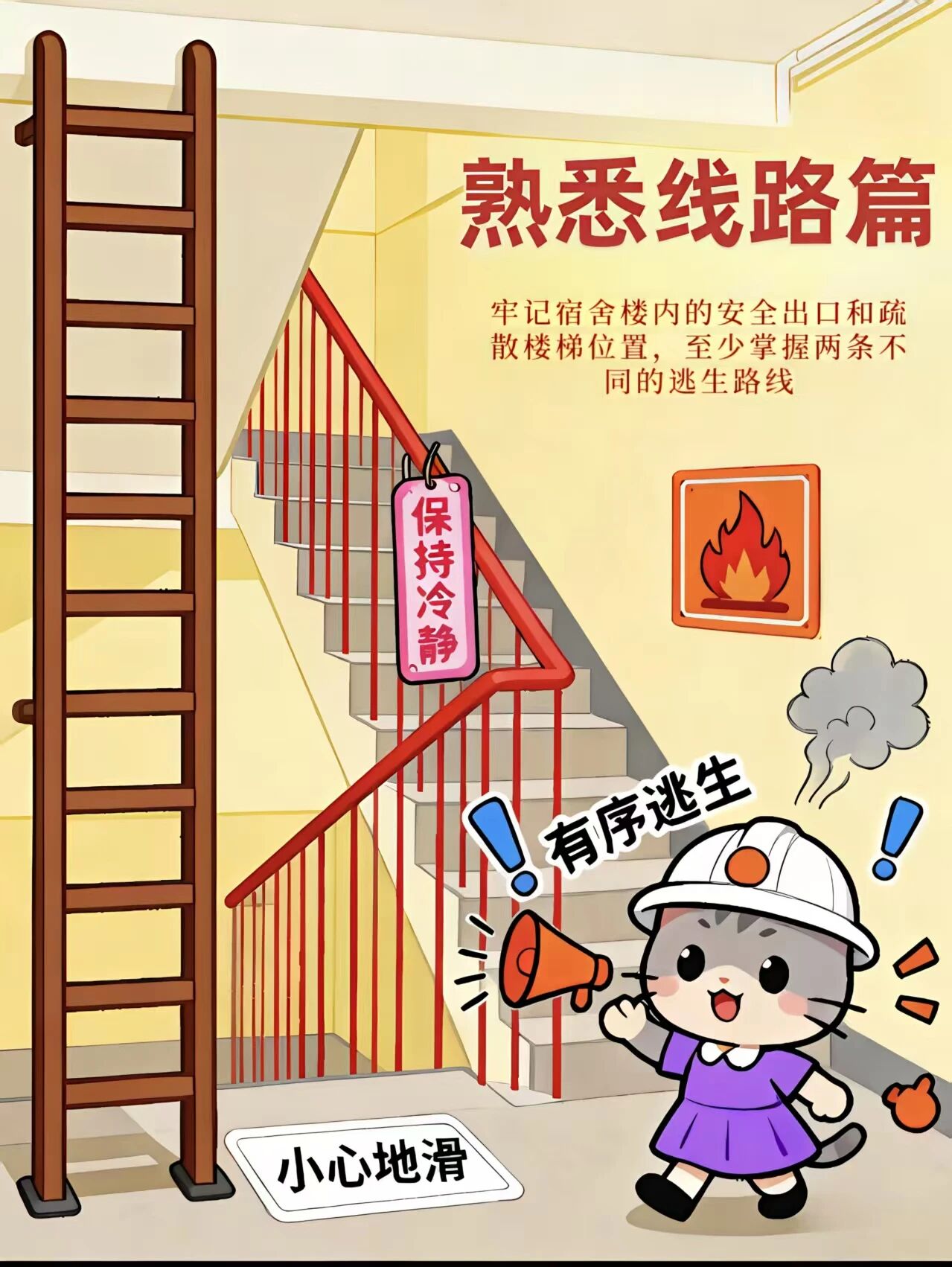 1.提前熟悉宿舍樓層消防栓、滅火器、應急指示燈的位置,牢記滅火器“提、拔、握、壓”使用步驟(提滅火器→拔保險銷→握噴管對準火源根部→壓下手柄噴射)。