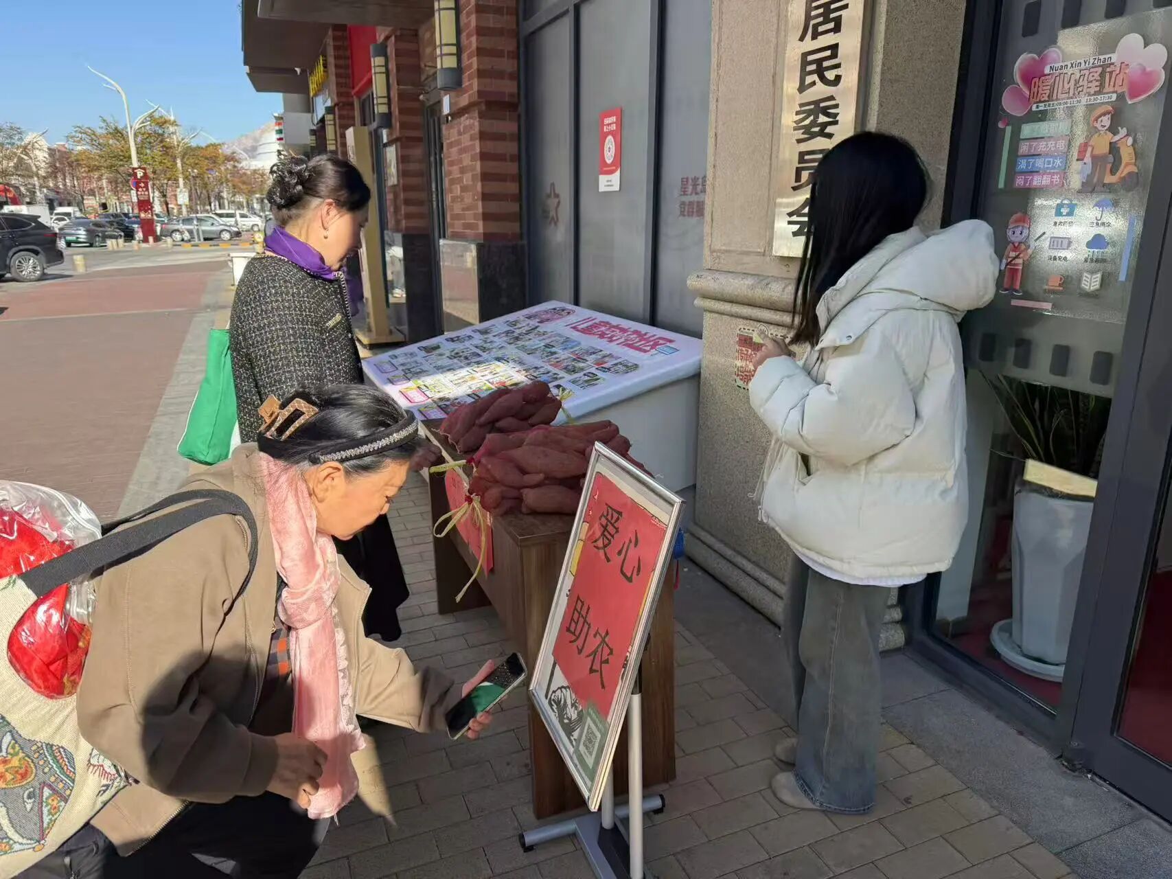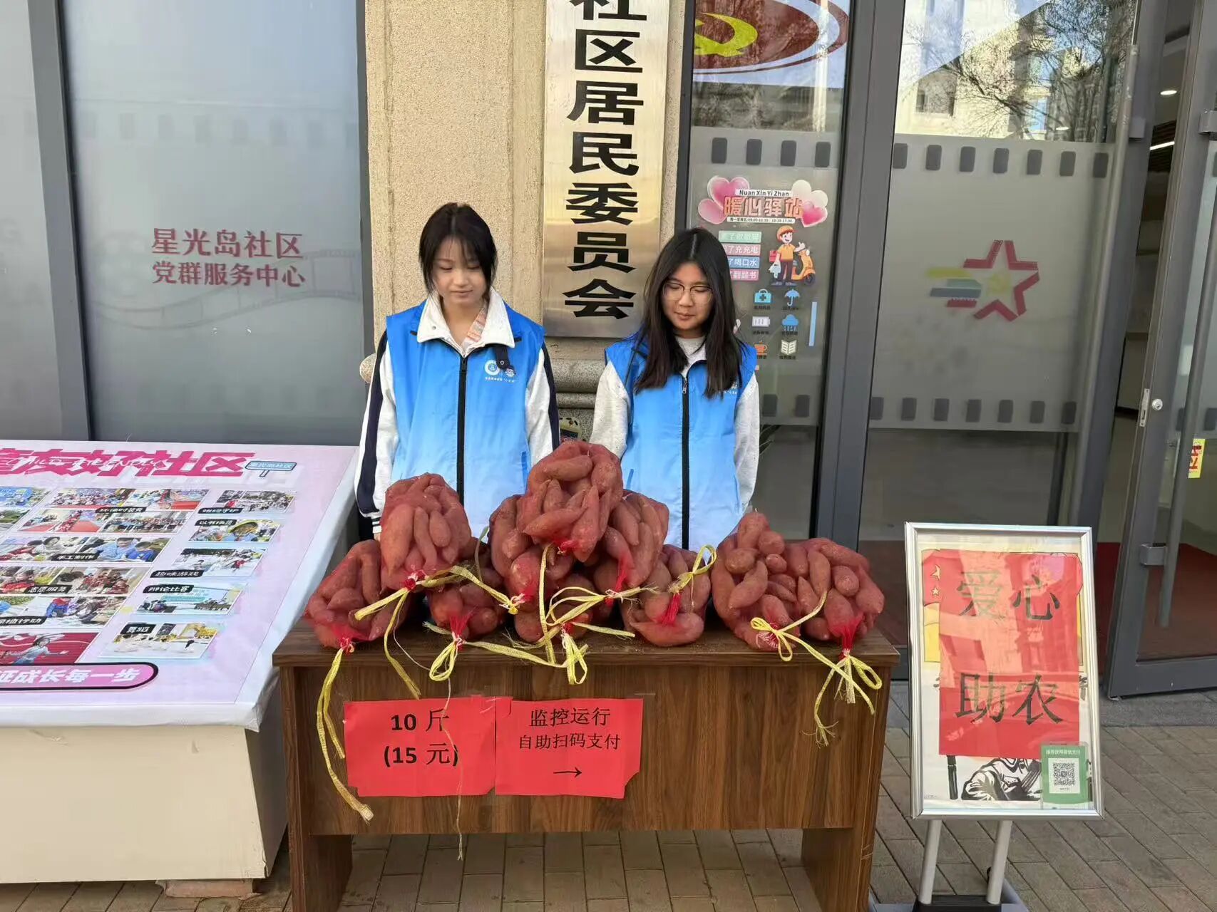 活動籌備階段,“小黃鋒”志愿者們提前行動。他們主動對接地瓜農戶,深入了解農產品銷售困境,隨后協助農戶分揀、打包地瓜,確保每份地瓜新鮮優質;同時與社區工作人員配合,在社區內選定銷售點位,搬運展臺、張貼助農海報、擺放價格標識,細致的籌備工作為活動順利開展筑牢基礎。