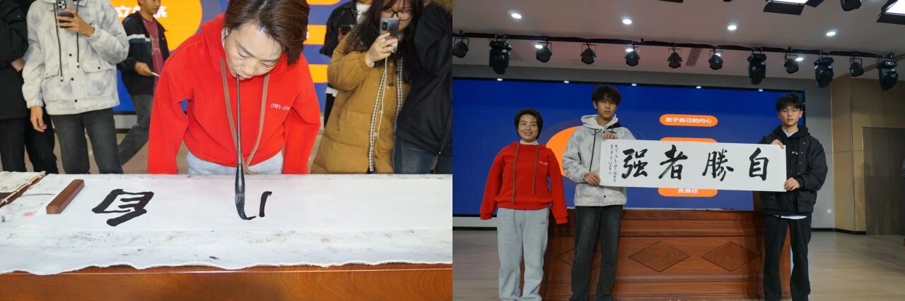 活動最后,有著“全國唯一女口書畫家”稱號的任仕春老師寫下了書法作品“自勝者強”。這不僅是一副作品更是對同學們未來的期望,所示著身體的“剝奪”從來不是終點,堅韌、勇氣與永不設限的心態,終將把苦難化為生命的饋贈,讓折翼的人生也能翱翔于理想的高空。