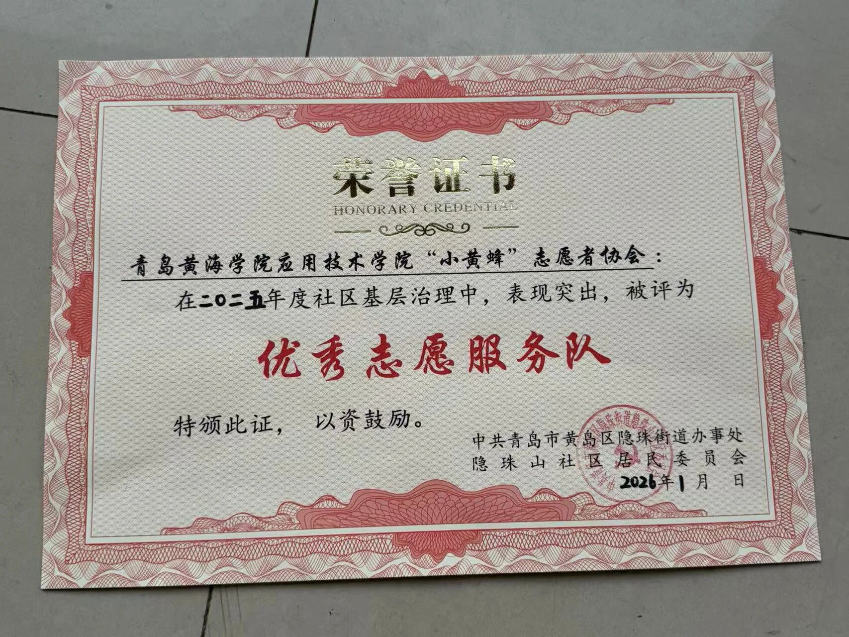 青島黃海學院應用技術學院“小黃鋒”志愿者協會在隱珠山社區二〇二六年度社區基層治理中表現突出,被中共青島市黃島區隱珠山街道辦事處、隱珠山社區居民委員會授予“優秀志愿服務隊”榮譽稱號!這份沉甸甸的肯定,是對協會長期扎根社區、踐行雷鋒精神的最好褒獎,更是對每一位“小黃鋒”志愿者無私奉獻的深情致敬。