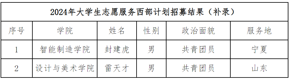 根據《關于做好2024—2025年度西部計劃志愿者招募派遣及山東計劃相關工作》補錄志愿者的通知,經學生自愿報名、學院審核推薦、學校團委組織考試(筆試、面試)考察、體檢結果并結合服務地相關要求,現將我校 2024年大學生志愿服務西部計劃招募補錄結果予以公示,公示期5個工作日。