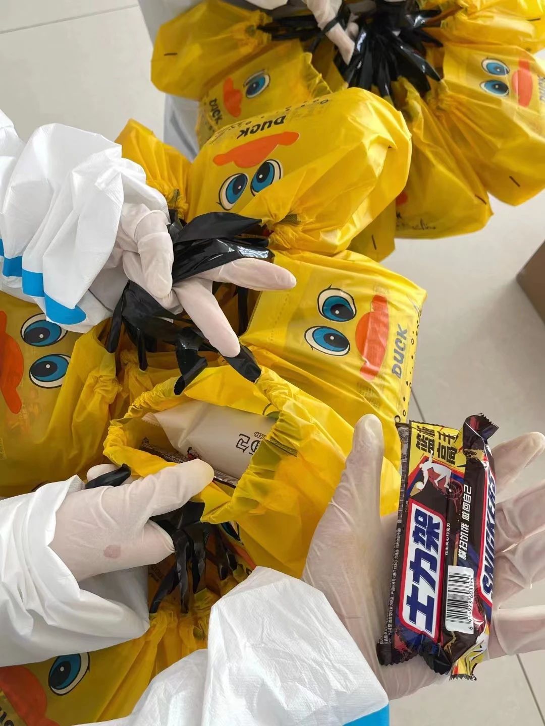 能量包包裹的不是零食,而是黃海滿滿的愛,“志”在心中,“愿”在行動!有幸做一名志愿者,盡微薄之力,我沒想過做志愿者會得到什么,我搬完物資,送完餐,堅守值班樓層,聽到的每一聲謝謝,真是最好的回報,有時夜里是孤獨的,但有學校領導老師一直陪伴,總有人會比我們更疲憊,我們也更加堅定的堅持下去,愿疫情早日結束。