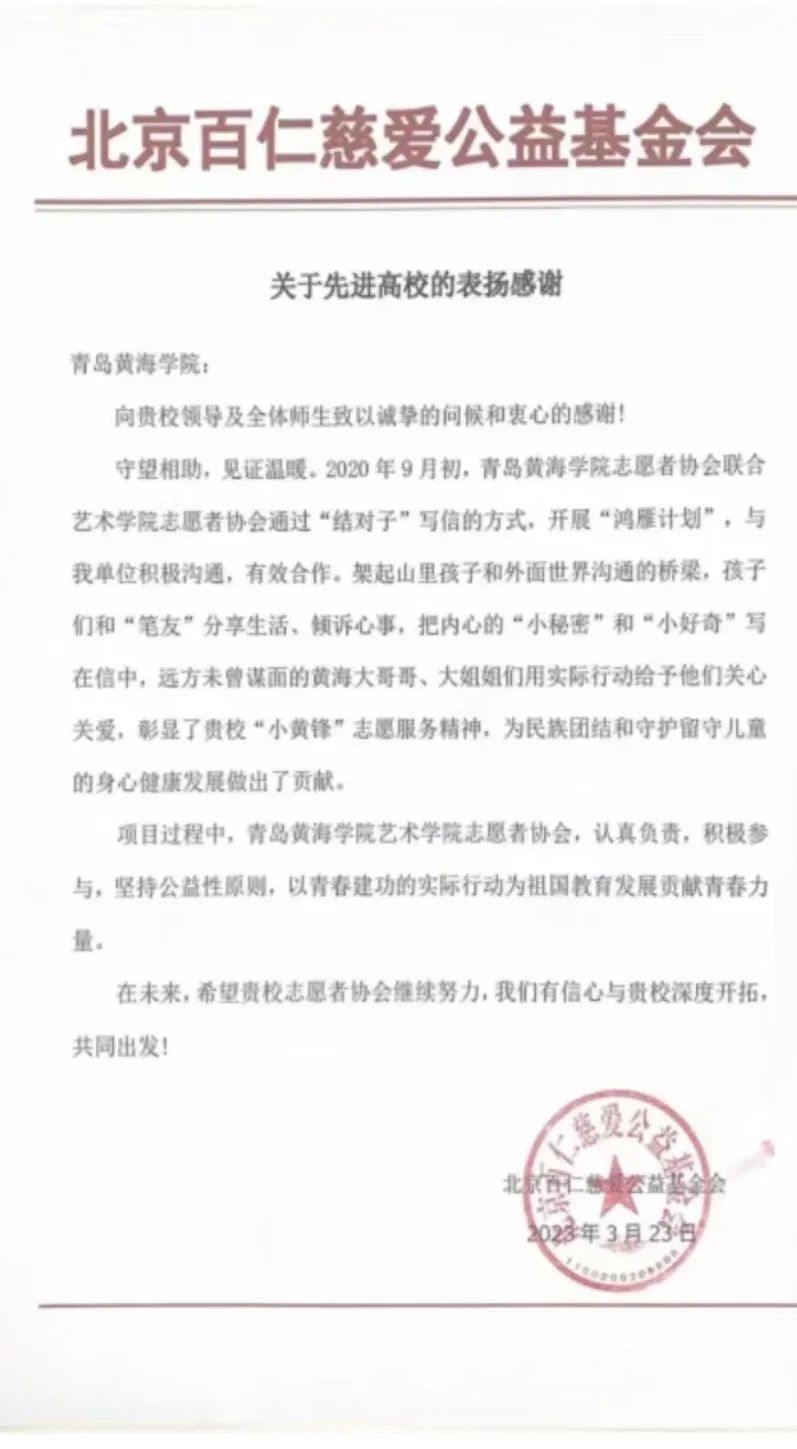 北京百仁慈愛公益基金會給青島黃海學院的表揚信和致謝信。