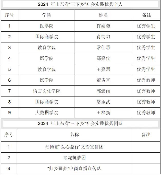 為深入學習宣傳貫徹習近平新時代中國特色社會主義思想,全面貫徹落實黨的二十大精神,切實發揮共青團作為廣大青年在實踐中學習中國特色社會主義和共產主義的學校作用,引導和幫助廣大青年學生在與現實相結合的“大思政課”中“受教 育、長才干、作貢獻”,引領學生立志做有理想、敢擔當、能吃苦、肯奮斗的新時代好青年。根據《關于梳理總結2024年山東省暑期三下鄉社會實踐活動情況的提示》文件要求,前期對我校2024年暑期“三下鄉”社會實踐活動優秀服務團隊、優秀個人、特色品牌項目進行嚴格審核并進行申報至團省委,根據團省委工作安排,現將2024年山東省“暑期三下鄉”總結通報結果予以公示,從即日起予以公示,公示期5個工作日。
