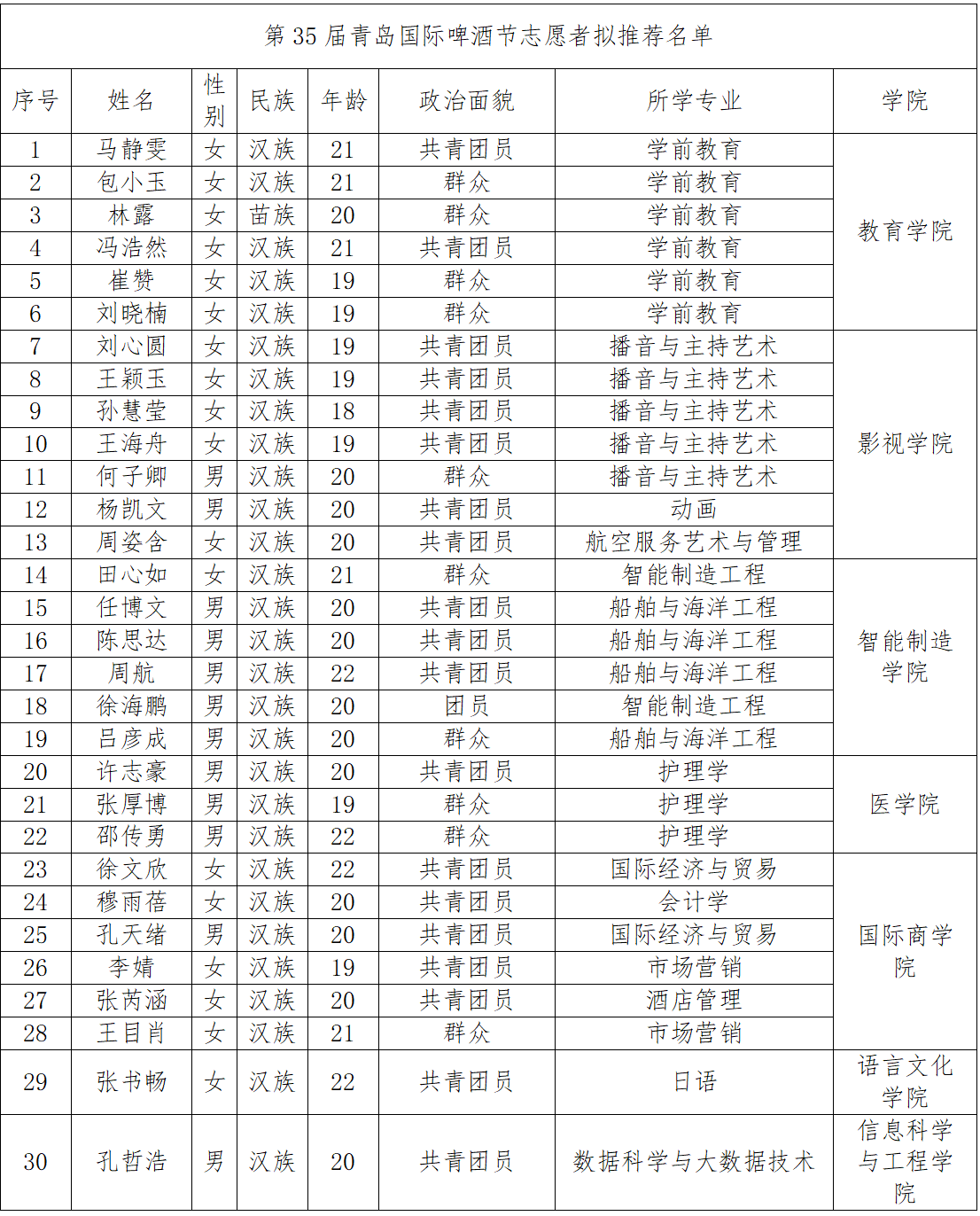 第35屆青島國際啤酒節將于7月18日至8月16日在金沙灘啤酒城舉行,為確保第35屆青島國際啤酒節志愿服務工作規范高效、順暢有序,積極踐行“奉獻、友愛、互助、進步”的志愿精神,根據《關于協助做好第35屆青島國際啤酒節志愿者招募工作的函》文件要求,經自愿報名、資格審查、學院推薦等環節,對候選人提交的材料進行初步審核,本著"公平、公正、公開"的原則進行面試,第35屆青島國際啤酒節志愿者擬推薦學生30名,從即日起予以公示,公示期3天。