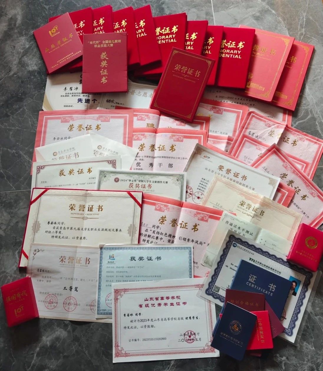 在李若冰備考的這段時間里,比賽、兼職貫穿始終。2024年3-6月份,她作為負責人帶領團隊在第14屆挑戰杯獲得山東省銀獎,“建行杯”大學生創新大賽獲得山東省銅獎。2025年3月12日(河北省考前3天),她帶隊參加第二屆山東省大學生職業規劃大賽獲得銀獎。