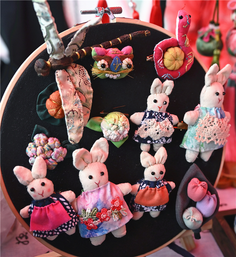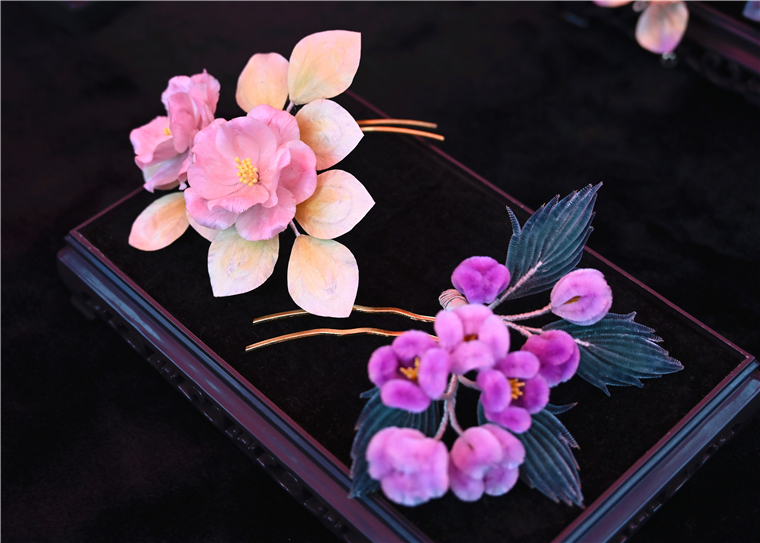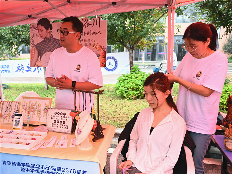 田清來會長表示:“今天我們協會帶來了膠東繡球、瑞蚨祥絲綢飾品、蠶絲絨花、崖柏雕刻等十多個非遺項目,讓黃海師生近距離觀賞匠人們的精湛技藝,也能觸摸到傳統文化、非遺文化的溫度與堅守。”