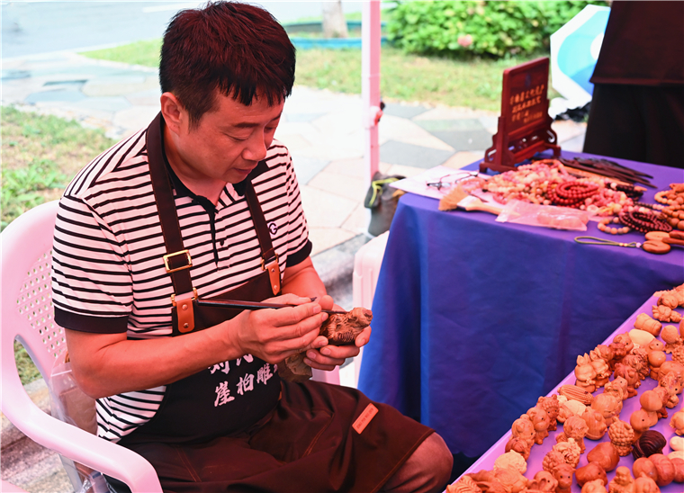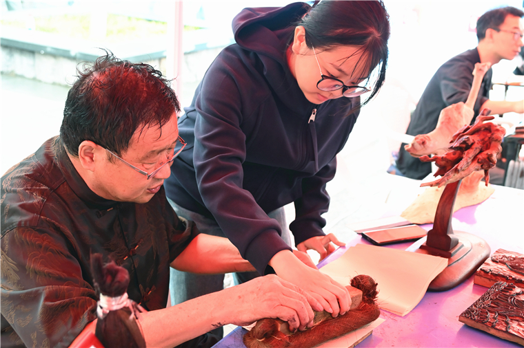 青島市民俗學會會長田清來與協會十余位非遺匠人一同來到活動現場,與黃海學子共赴這場傳統文化盛宴。葫蘆烙畫、鞏氏根藝、木版年畫,古老技藝折射歲月之光;宋代點茶制香、非遺螺鈿、非遺絨花,盡顯華夏高雅審美。