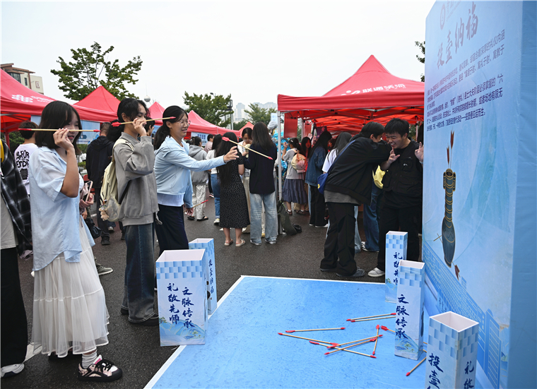 在傳統游戲互動區域,投壺雅戲的參與者屏氣凝神、瞄準投擲,在規則中學習把控節奏;國風燈謎前,師生們駐足沉思、熱烈討論,在解謎過程中體驗思維碰撞的樂趣;蹴鞠區域,一場“古風版”足球賽激情上演,學生們踴躍上場,感受蹴鞠的踢、蹴、蹋等技巧,于動靜之間體會傳統文化“張弛有度”的深刻智慧。