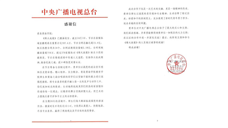 中央廣播電視總臺在感謝信中特別指出,我校師生以高度的政治責任感和歷史使命感,生動詮釋了銘記歷史、珍愛和平的深刻主題,展現了新時代青年昂揚向上的精神風貌。此次合作既是高水平的藝術實踐,更是一堂深刻的愛國主義教育大課。