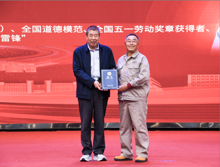 在全場師生熱烈的掌聲中,李清山為郭明義頒發“新時代雷鋒精神育人”客座教授聘書。