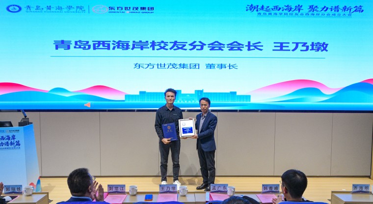 孟廣東、劉常江等與會領導分別為新當選的會長、副會長、秘書長、副秘書長及理事頒發了聘書。在全場熱烈的掌聲中,孟廣東、劉常江與新任會長王乃墩共同按下了象征分會正式成立的啟動鍵,并為“青島黃海學院校友會西海岸分會”銅牌揭牌,標志著青島西海岸校友正式擁有了屬于自己的“校友之家”。