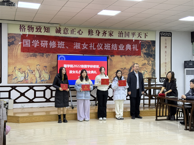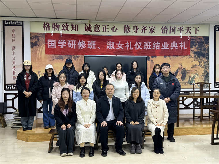 2025年12月26日晚7點,國學院在知誠樓孔子學堂舉行2022級國學研修班、淑女禮儀班學生結業典禮。語言文化學院(國學院)副院長張維霖及部分教師代表出席了典禮。典禮由傳統文化教研室主任李昕昕主持,2022級結業學生代表、部分24級和25級學生共同見證了這一莊重而溫馨的時刻。