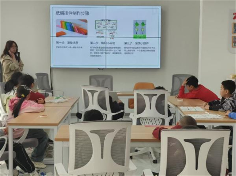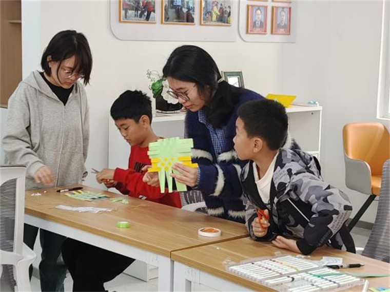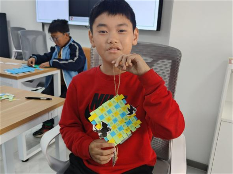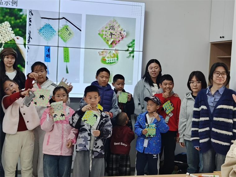 最后,志愿者與孩子們一起制作清明主題紙編掛件。大家先將彩紙剪成14條等長紙條,隨后在志愿者的指導下交錯編織成小網格,最后用彩筆和貼紙裝飾上青團、柳枝等清明元素。孩子們捧著自己的作品,在動手實踐中感受傳統節日的樂趣。
