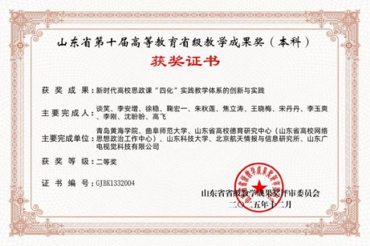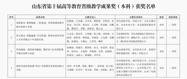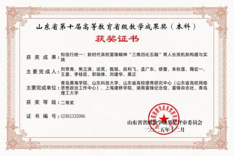 近日,《山東省教育廳關于開展第十屆高等教育省級教學成果獎評選工作的通知》(魯教高函〔2025〕21號)及評審結果公示,我校馬克思主義學院在山東省第十屆高等教育省級教學成果獎評選中喜獲3項二等獎,實現歷史性突破。其中,學院主持申報的《新時代高校思政課“四化”實踐教學體系的創新與實踐》《知信行統一:新時代高校雷鋒精神“三維四化五融”育人長效機制構建與實踐》兩項成果均榮獲本科類二等獎;另有參與完成的《四方聯動·四鏈融通·學用貫通:跨境電商應用型人才培養模式十年創新實踐》項目,作為聯合申報單位也獲得本科類二等獎。