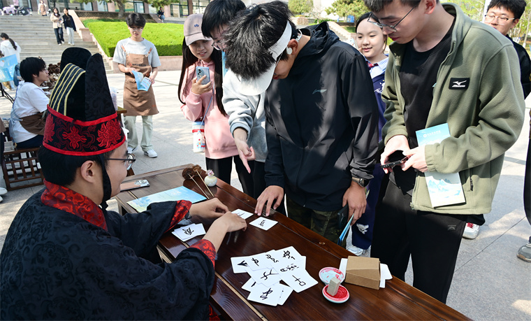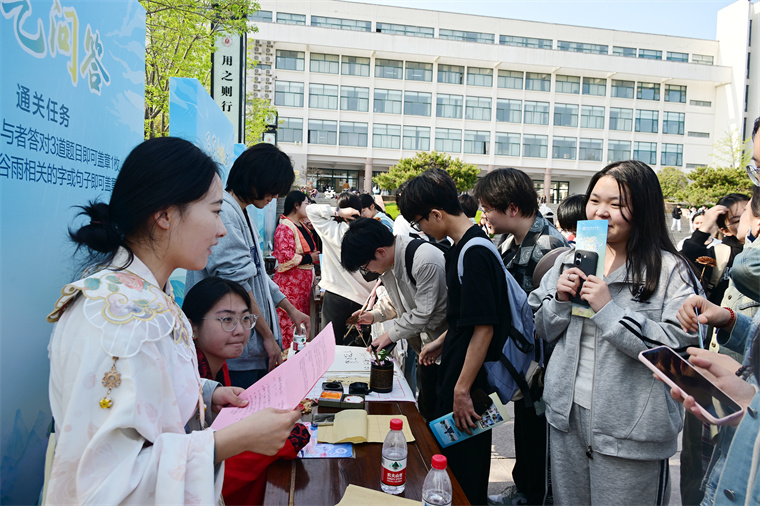 在“倉頡問字”任務點,參與者要從五張甲骨文字卡中認出至少三個字,2024級漢語言文學專業的王同學舉著集章冊滿臉興奮:“我認出了'雨''谷''田'三個字,原來甲骨文這么有趣!”一旁的“谷雨使者”還會耐心講解每個字的演變,讓古老文字變得鮮活可感。