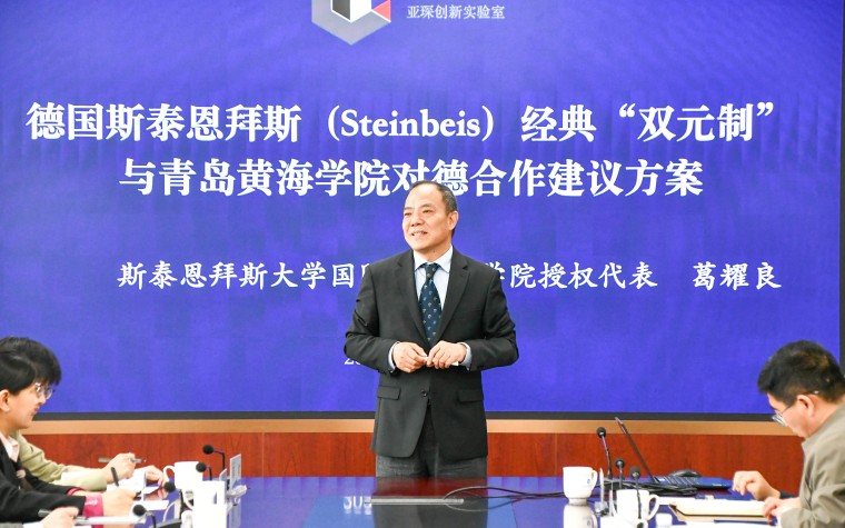 會上,葛耀良理事長以《德國斯泰恩拜斯(Steinbeis)經典“雙元制”與青島黃海學院對德合作建議方案》為題,從三個維度進行了深入闡述。他系統介紹了德國經典“雙元制”職業教育制度的內涵與核心理念,深入分析了新形勢下技能人才培養模式的未來發展趨勢,并結合青島黃海學院的辦學特色與發展定位,提出了具體可行的對德合作建議方案,為學校推進國際化辦學提供了重要參考。