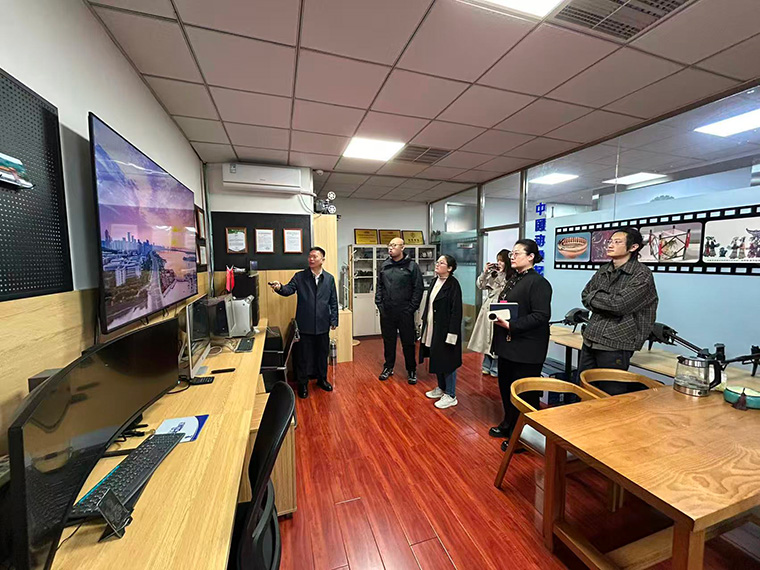 在企業方的熱情接待下,學院一行參觀了影視中心、后期制作中心及優秀影像成果展,青島寶藍智能科技有限公司在影視拍攝、創意設計、后期剪輯等領域積累的豐富經驗和高質量成果,給學院老師留下了深刻印象。企業總經理薛良選、影視總監張洪濤、攝影師薛宏偉詳細介紹了發展歷程、業務布局與商業影視項目全流程運作模式,雙方就行業技術趨勢與崗位能力要求展開初步交流。