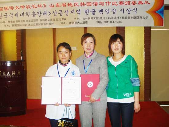 本報訊(應用外語系供稿)4月23日,由中央民族廣播電視臺朝鮮部、黑龍江新聞、吉林韓文報社、延邊衛視主辦,吉林朝鮮文報刊《韓國語村》編輯部、韓國國際大學承辦的“韓國國際大學校長杯”中國大學生韓國語寫作比賽(山東地區)在青島市隆重舉行。本次大賽共五十余所高等院校參加。分專科組和本科組兩個級別。應用外語系2008級應用韓語專業的徐彥同學表現突出,榮獲專科組金獎,并得到赴韓國國際大學免費研修三周的學習機會。該獎是山東地區民辦高校中獲得的最高級別的獎勵,其指導老師玄美順獲得優秀指導教師獎。