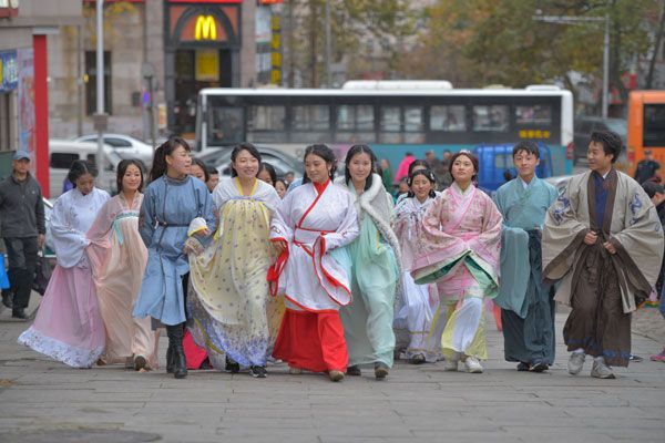提到中國傳統服裝,很多人對滿族樣式的旗袍和立領的中山裝比較熟悉。但近年來,越來越多年輕人喜歡上了漢服,從漢代的曲裾、唐代的齊胸襦裙、宋代的褙子到明代的襖裙,漢服種類豐富,氣質優雅。參加這次活動大二男生后揚說:“漢服可以帶來一種歸屬感。”可以這樣說,年輕一代在各國文化的交流碰撞中長大,越發想找回自己民族的感覺,著漢服是在尋根。