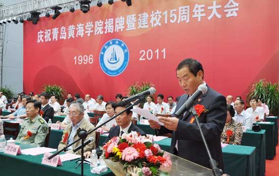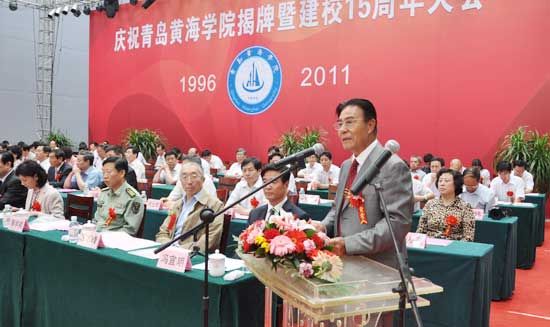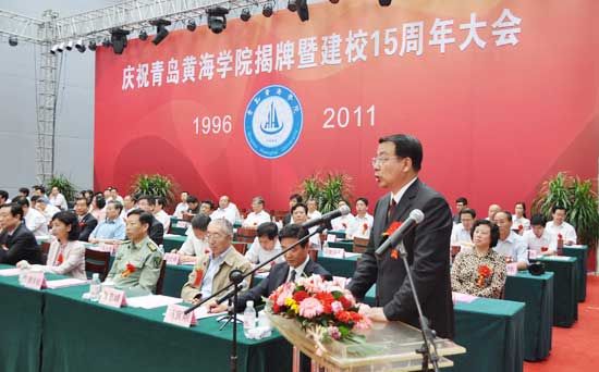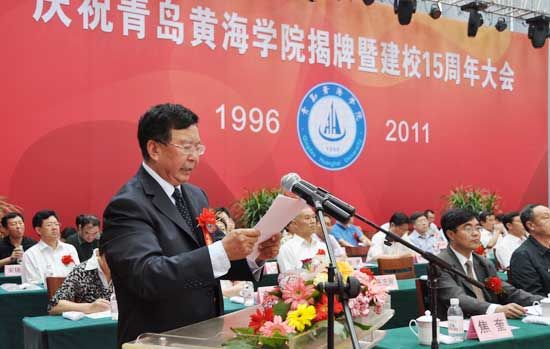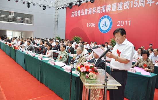 上午10點,青島黃海學院揭牌暨建校十五周年慶典在莊嚴的國歌聲中正式開始。全國人大原副委員長王漢斌、山東省第九屆人大常委會主任韓喜凱等各級領導、全國高等學校設置委員會副主任林鈞敬和山東大學、中國海洋大學、中國石油大學、北京大學研究生院、中國人民解放軍雷鋒生前所在團等兄弟院校及單位紛紛發來賀信賀電。揭牌儀式由學院黨委書記馮宜明主持。首先由全國高等學校設置委員會副主任劉鳳泰宣讀《教育部關于同意在青島黃海職業學院基礎上建立青島黃海學院的通知》,山東省教育廳副廳長陳光華宣讀《山東省人民政府關于將青島黃海職業學院改建為青島黃海學院的通知》。隨后,青島黃海學院院長焦奎致辭。他說,青島黃海學院是在我國教育改革發展大潮中成長起來的一所民辦高校。學院以服務為宗旨,以就業為導向,踐行“知行合一”校訓,堅持走內涵、特色、和諧和創新發展之路。經過長時期全面建設,學院成功晉升為本科院校。在深感欣慰和自豪的同時,學院將認真總結經驗,保持高度清醒和自覺,認清形勢,搶抓機遇,迎接挑戰、奮發努力,開創未來。