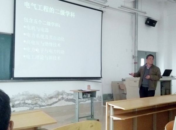 公茂法教授一直從事電氣工程及其自動化專業的教學及管理工作,本次報告他主要從專業介紹和人才培養體系兩個方面進行。公教授首先對電氣工程的學科分類、學科方向、發展簡史、近年發展狀況及發展前景做以剖析。隨后針對我校學生培養定位及專業建設特點,公教授為學生介紹了專業課程設置、實踐課體系以及核心課程的學習方法。對于學生提出的疑問和問題,公教授給予認真的解答,并為學生分析了當前的考研和就業形勢,并鼓勵大家珍惜這來之不易的機會和大學的美好時光,勤奮、求實、團結、創新,學好本領,創造美好的明天。