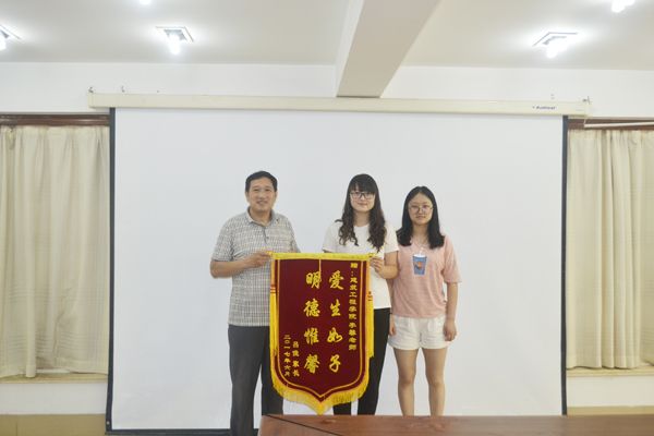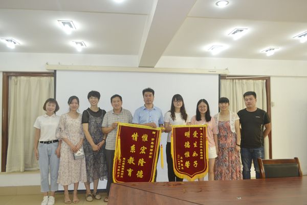 6月28日,身體已經基本恢復的呂佳和爸爸滿懷感激之情來到了學校,將兩面分別繡有“惟宏隆德 情系教育”“愛生如子 明德惟馨”送給學校和輔導員李馨老師,以此感謝學校、老師以及同學們對孩子無微不至的照顧和關懷,讓呂佳能在第一時間得到了最佳的治療,使孩子轉危為安!感謝老師把學生當作自己的孩子一樣照顧,感謝同學們占用自己的復習時間幫助她康復……