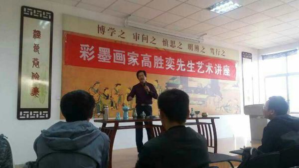 2017年10月31日14時30分,我校圖書館在知誠樓三樓的儒商學堂成功舉辦了彩墨畫家高勝奕先生藝術講座.出席本次講座的還有高先生的好友棗莊市書畫、陶瓷鑒定師周繼航先生及圖書館副館長徐偉。來自藝術學院的近百名學生聆聽了講座。黃海學院書法協會副主席張化雄老師主持了本次講座。