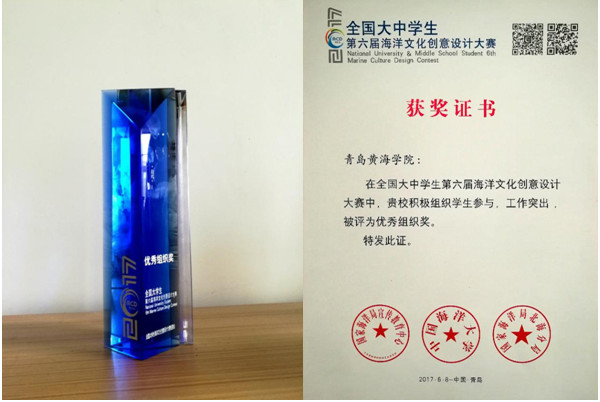 近日,由國家海洋局宣傳教育中心、中國海洋大學和國家海洋局北海分局聯合舉辦的第六屆全國大中學生海洋文化創意設計大賽圓滿閉幕,由我校藝術學院徐海霞老師指導的視覺傳達設計專業學生陳天俊、劉靜靜和徐林的作品在本次大賽中獲入圍獎。同時,學校獲得“優秀組織獎”。