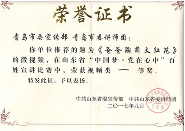 近日,由中共山東省委宣傳部、中共山東省委講師團聯合舉辦的“中國夢,黨在我心中”主題宣講比賽順利落下帷幕。由中共黃島區委宣傳部監制的微電影《爸爸胸前大紅花》通過了初賽、復賽和決賽的激烈角逐,從眾多優秀參賽作品中脫穎而出,榮獲全省視頻類一等獎。